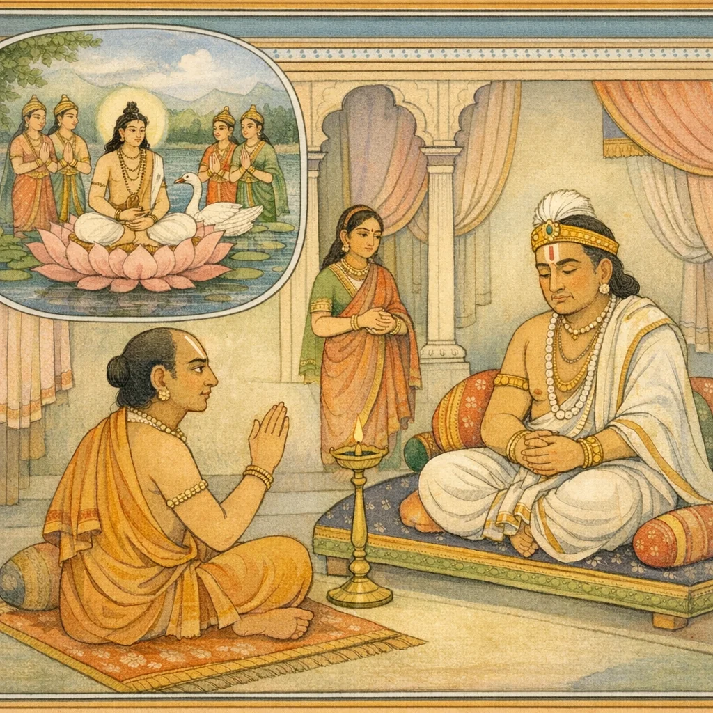 Long ago, the great sage—firm in his austere vows—wandered in the form of a haṃsa (the emblematic ‘paramahaṃsa’). In that ancient time, the Sādhya gods approached that supremely wise one and questioned him, seeking guidance on right conduct and higher truth.