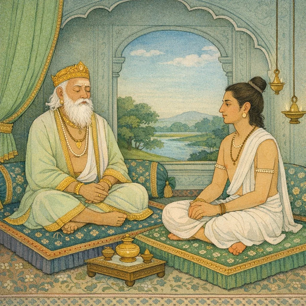 Chapter Arc: विदुर के वचनों से उद्विग्न धृतराष्ट्र, राजसभा में सनत्सुजात को बुलाकर एक ही प्रश्न को पकड़ लेते हैं—यदि ‘मृत्यु नहीं’ तो देव-दानव तप करके ‘अमृतत्व’ क्यों चाहते रहे? → सनत्सुजात ‘मृत्यु’ के अर्थ को उलट देते हैं: कोई उसे कर्म-फल की अनिवार्यता मानता है, कोई अज्ञानजन्य भ्रान्ति। धृतराष्ट्र की जिज्ञासा बढ़ती है—कर्म, भोग, और देह-बंधन कैसे मनुष्य को मृत्यु के चक्र में घुमाते हैं? → उपदेश का शिखर तब आता है जब सनत्सुजात स्पष्ट करते हैं कि ‘मृत्यु’ का मूल अज्ञान है; कर्म-फल में आसक्ति और भोग-योग देही को बाँधते हैं, और विवेक-योग/सदर्थ-ज्ञान के अभाव में वह उससे ‘तर’ नहीं पाता। → सनत्सुजात क्षत्रिय-धर्म के भीतर ब्रह्म-प्राप्ति का मार्ग दिखाते हैं—संयम, सत्य, आर्जव, ह्री, दम, शौच, विद्या जैसे द्वारों से दुर्लभ ‘ब्राह्मी श्री’ (आध्यात्मिक समृद्धि) मिलती है; मान (अहंकार/प्रतिष्ठा) और मौन (अन्तर्मुख साधना) का सहवास कठिन है—इसलिए भीतर की साधना को प्रधान करो। → धृतराष्ट्र के भीतर ज्ञान की झलक तो पड़ती है, पर प्रश्न शेष रहता है—क्या वह इस उपदेश को अपने पुत्र-मोह और राज्य-आसक्ति पर लागू कर पाएँगे?