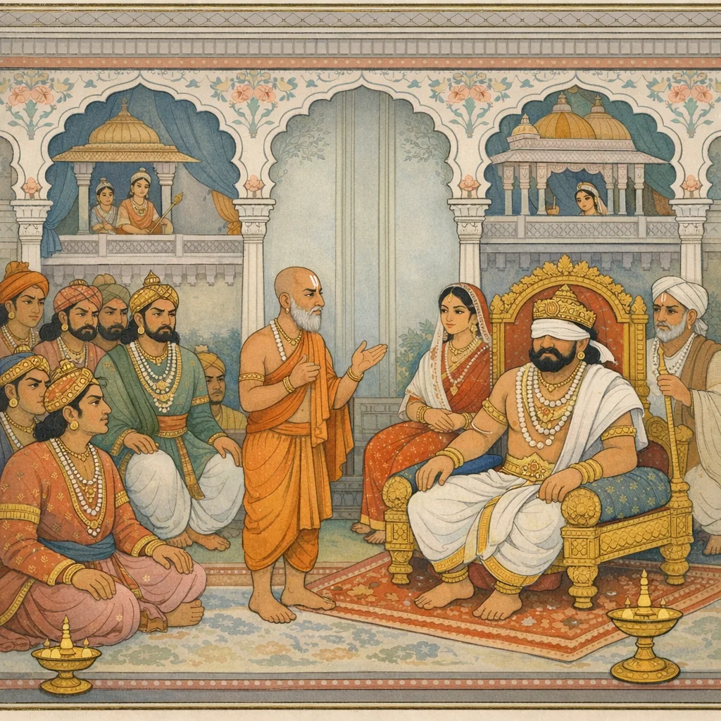 Chapter Arc: रात्रि के बीतते ही प्रभात में कौरव-सभा जाग उठती है—पाण्डवों के शिविर से लौटे सूतपुत्र संजय को सुनने हेतु धृतराष्ट्र-प्रमुख समस्त राजागण सभा में उमड़ पड़ते हैं। → सभा देव-सभा-सी भरती जाती है; दुर्योधन-पक्ष के उग्र योद्धा (दुःशासन, कर्ण, शकुनि, उलूक आदि) अमर्ष से भरे उपस्थित होते हैं, जबकि विदुर और युयुत्सु जैसे विवेकशील भी वहीं हैं—एक ही कक्ष में नीति और हठ का टकराव सघन होता जाता है। → संजय स्पष्ट घोषणा करता है कि वह पाण्डवों से मिलकर लौटा है और बताता है कि पाण्डव कुरुओं का यथोचित सम्मान करते हैं; फिर वह धृतराष्ट्र के आदेशानुसार जो संदेश लेकर गया था, उसके प्रत्युत्तर का वृत्तांत सुनाने को उद्यत होता है—सभा का समस्त ध्यान उसी वाणी पर टिक जाता है। → अध्याय का समापन सभा-प्रवेश, आसन-ग्रहण और संजय के प्रतिवेदन की भूमिका पर होता है—कौरव-सभा एकत्रित होकर ‘अब क्या कहा गया?’ के प्रश्न पर स्थिर हो जाती है। → संजय के मुख से पाण्डवों (विशेषतः वासुदेव और धनंजय) की धर्मयुक्त वाणी का वास्तविक विवरण अगले अध्यायों में खुलने वाला है।