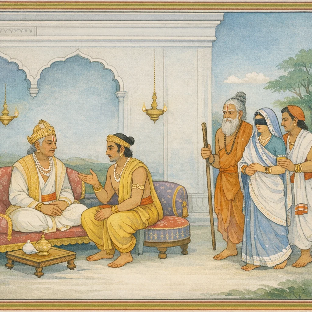 Chapter Arc: सभा से समस्त राजाओं के उठ जाने पर धृतराष्ट्र, पुत्र-विजय की आशा में, संजय को एकान्त में बुलाकर पाण्डवों और अपनी सेना की वास्तविक सामर्थ्य–दुर्बलता पूछते हैं। → धृतराष्ट्र का प्रश्न केवल सैन्य-गणना नहीं, भविष्य का निर्णय है—वे जानना चाहते हैं कि ‘कौन ज्येष्ठ, कौन कनिष्ठ’ और किसका पलड़ा भारी है; संजय, केशव–पार्थ के मत को ‘यथातथ्य’ कहने की तैयारी करता है, जिससे राजा की आशा और भय दोनों तीव्र होते जाते हैं। → संजय के कथन के आधार पर विदुर शीघ्रता से व्यास और गान्धारी को सभा में ले आते हैं; महाप्राज्ञ कृष्णद्वैपायन व्यास स्वयं आगे बढ़कर संजय को आदेश देते हैं कि धृतराष्ट्र के प्रश्न का उत्तर वासुदेव और अर्जुन के विषय में सत्य-सत्य, जैसा जानता है वैसा ही कहे। → व्यास का आदेश कथा को ‘राजनीतिक अनुमान’ से उठाकर ‘ऋषि-प्रमाणित सत्यवचन’ के धरातल पर स्थापित कर देता है; धृतराष्ट्र के सामने अब टालने योग्य नहीं, सुनने योग्य सत्य आने वाला है। → संजय को सत्य-वर्णन का आदेश मिल चुका है—अब वह धृतराष्ट्र को पाण्डवों की शक्ति और केशव–पार्थ के निश्चय का निर्णायक विवरण सुनाने ही वाला है।