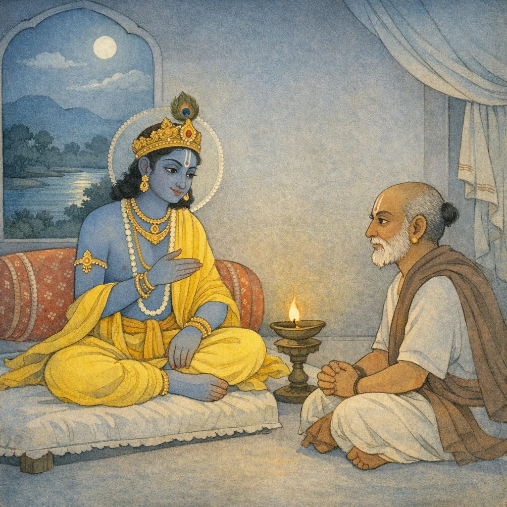 Chapter Arc: विदुर के वचनों को सुनकर श्रीकृष्ण शांत, तर्कपूर्ण स्वर में बताते हैं कि कौरव-पाण्डवों के बीच संधि-प्रयत्न करना क्यों धर्मसंगत और आवश्यक है। → कृष्ण ‘धर्म+अर्थ+युक्ति’ के आधार पर अपना उद्देश्य स्पष्ट करते हैं—यदि दुर्योधन जैसे ‘बाल’ (मूढ़) ने भी शांति-वाणी न मानी, तब भी प्रयास का पुण्य और लोक-न्याय स्थापित होता है; वे विदुर से अपने आगमन-हेतु पर सावधान होकर सुनने को कहते हैं। → कृष्ण का निर्णायक प्रतिपादन: मनुष्य यदि अपनी शक्ति भर धर्म-कार्य का प्रयत्न करे तो वही पुण्य है; मित्र को चोटी पकड़कर भी अधर्म से रोकने का यत्न करने वाला निंद्य नहीं—अतः मैं शांति के लिए ऐसी वाणी बोलूँगा जो धर्म-समान, अर्थवती और अहिंसक हो, और कुरुजन उसे देखें-समझें। → कृष्ण यह भी संकेत करते हैं कि यदि दुर्योधन ने इस ‘कष्टनिवारक’ और हितकारी वचन को न अपनाया तो वह दिष्टि (भाग्य/विनाश-प्रवृत्ति) के वश जाएगा; फिर वे विश्राम हेतु शयन करते हैं—यात्रा और दूतकार्य की तैयारी पूर्ण होती है। → कृष्ण की शांति-यात्रा आरंभ होने से पहले प्रश्न लटकता है—क्या धृतराष्ट्र और दुर्योधन इस अहिंसक, धर्मार्थयुक्त वाणी को स्वीकार करेंगे, या विनाश की ओर बढ़ेंगे?