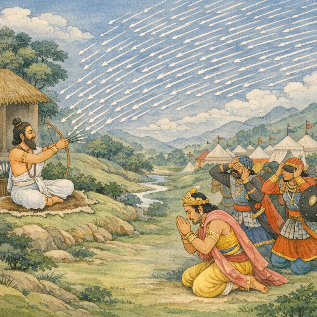 Chapter Arc: कुरुसंसद में राजाओं की सभा—धर्म और करुणा के सूक्ष्म भेदों का उपदेश सुनकर सब भूपाल मन-ही-मन उत्तर खोजते हैं, पर वाणी जैसे रुक जाती है। → सभा के मौन में जामदग्न्य परशुराम वचन उठाते हैं और एक दृष्टान्त सुनाते हैं—दम्भोद्धव नामक राजा तपस्वियों/महात्माओं को युद्ध के लिए ललकारता है; ब्राह्मण-तपस्वी बार-बार क्षमा माँगते हैं, फिर भी राजा का दर्प और आग्रह बढ़ता जाता है। → नर-स्वरूप महात्मा (भगवान् नर) मायिक सींक/तृण-बाणों से लक्ष्यवेध कर दम्भोद्धव की सेना की इन्द्रियों (आँख-कान-नासिका) को पीड़ित कर देता है; आकाश श्वेत-सा भर जाता है और राजा भयभीत होकर चरणों में गिर पड़ता है। → नर राजा को शरण देते हैं और धर्मोपदेश करते हैं—‘ब्रह्मण्य’ बनो, धर्मात्मा बनो, फिर ऐसा मत करना; दर्प-जनित युद्धेच्छा का परित्याग कर ब्राह्मण-हित और शरणागत-रक्षा का व्रत ग्रहण कराया जाता है। → परशुराम अस्त्रों के वास्तविक ‘वधक’ स्वरूप का संकेत करते हैं—काम, क्रोध, लोभ, मोह, मद, मान, मात्सर्य, अहंकार जैसे अंतःशत्रु ही मनुष्यों को मृत्यु की ओर ढकेलते हैं—अब सभा को अपने ही भीतर उत्तर ढूँढना है।