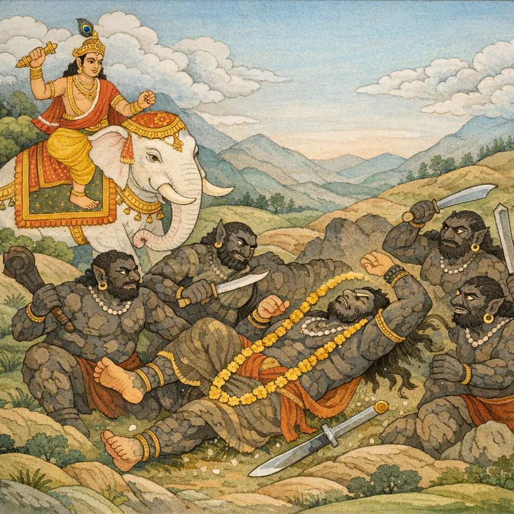 When that foremost of the Dānavas had been slain, Śakra (Indra), shaken by fear, ran to enter a lake in order to hide. In his panic he could not believe that the vajra had truly left his hand, nor—out of fear—could he accept with certainty that Vṛtra had indeed been killed. Thus is shown how even victory may be clouded by inner turmoil, and how fear can warp one’s grasp of reality and moral confidence.