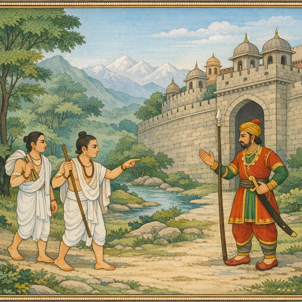 Having resolved thus, the maternal uncle and his sister’s son set out for King Janaka’s richly endowed sacrificial rite. On the way, Aṣṭāvakra encountered the king near the precincts of the sacrificial pavilion. When the king’s attendants tried to push him aside from the path, he spoke these words—signaling that true worth is not to be judged by outward appearance or social presumption, especially in a sacred setting devoted to truth and discernment.