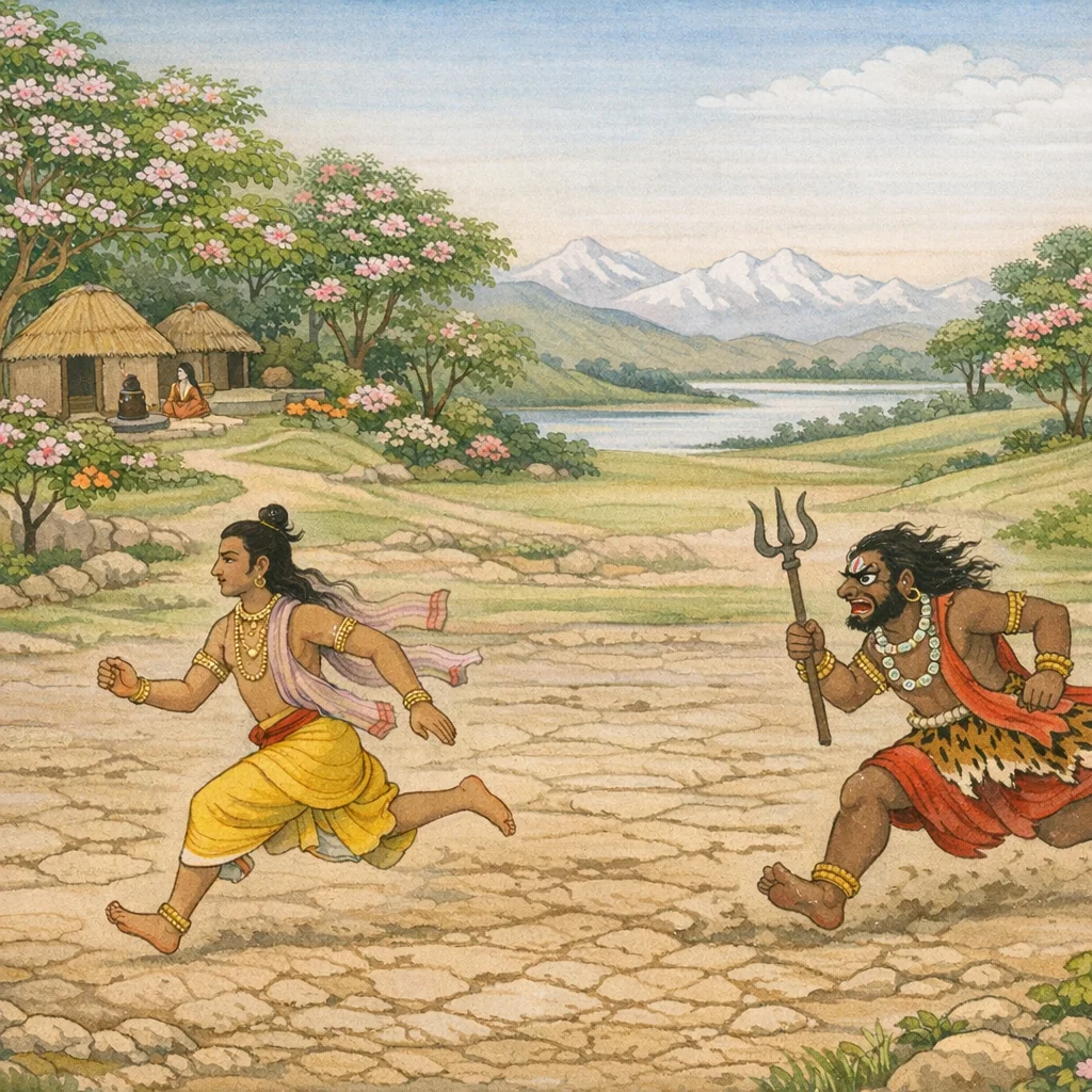 When Yavakrīta’s water-pot was snatched away, he was left in a state of ritual impurity (ucchiṣṭa). Seeing him thus vulnerable, the rākṣasa, trident raised, rushed straight at Yavakrīta.