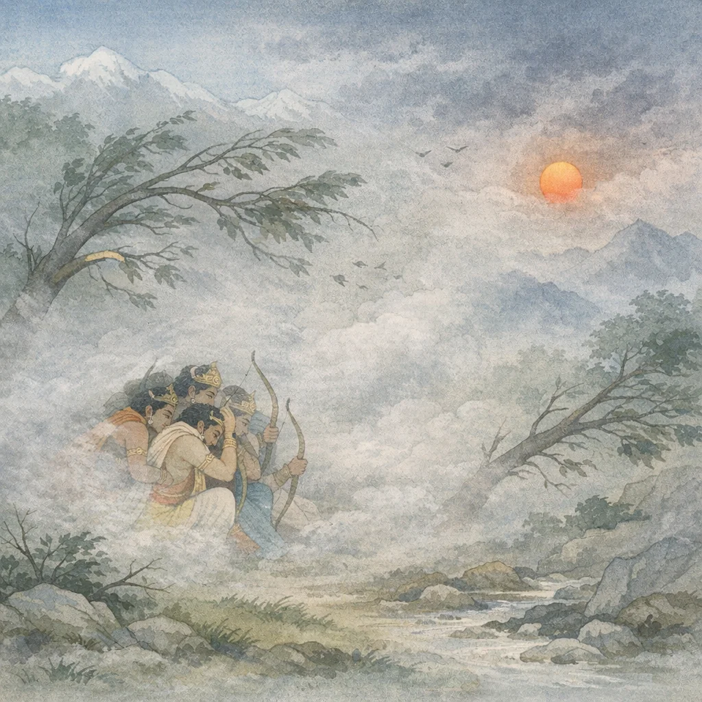 Chapter Arc: पाञ्चाली सहित पाण्डव—श्रेष्ठ धनुर्धरों के अग्रणी—गन्धमादन की ओर प्रस्थान करते हैं; पर्वत-शिखर पर सरोवर, सरिताएँ, वन और घनी छाया वाले वृक्ष उनके सामने खुलते जाते हैं। → देवर्षि-सेवित, नित्य पुष्प-फल वाले रम्य प्रदेशों के बीच अचानक प्रकृति का रौद्र रूप उतर आता है—धूल से आकाश ढक जाता है, दृष्टि नष्ट-सी हो जाती है, और वे परस्पर संवाद तक नहीं कर पाते। → प्रचण्ड वायु से वृक्ष टूट-टूटकर धरती पर गिरते हैं; महाशब्द उठता है और मोहग्रस्त योद्धा मन-ही-मन आशंका करते हैं—‘क्या आकाश गिर रहा है, क्या पृथ्वी फट रही है, क्या पर्वत टूट रहा है?’ → कुछ समय बाद कोलाहल थमता है, वायु सम हो जाती है, जल नीचे उतर जाता है और सूर्य प्रकट होता है; पाण्डव धीरे-धीरे निकलकर पुनः संगठित होते हैं। → तूफान के बाद वे फिर से गन्धमादन पर्वत की ओर आगे बढ़ते हैं—देवभूमि के भीतर आगे कौन-सी परीक्षा और कौन-सा दिव्य साक्षात्कार प्रतीक्षा कर रहा है?