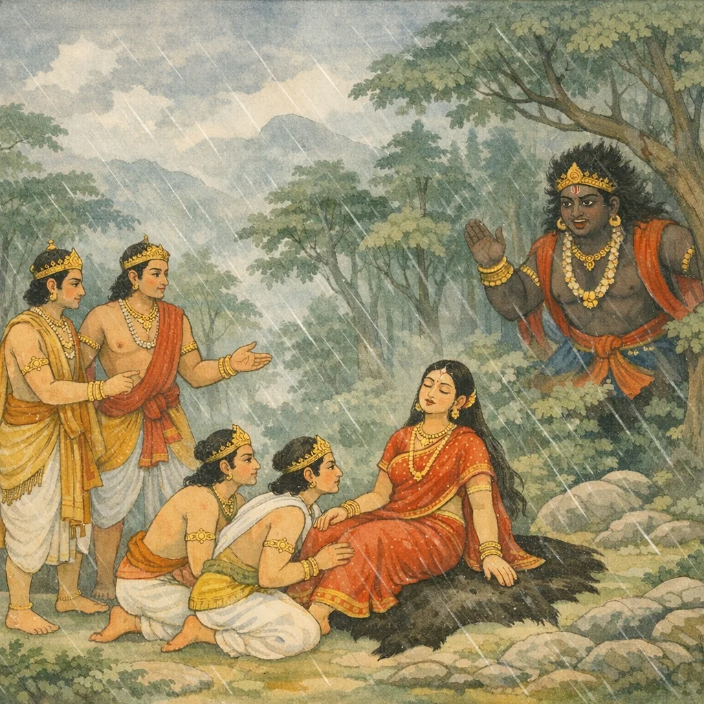 Chapter Arc: गन्धमादन-प्रवेश के कठिन पथ पर, वात-वर्षा और थकान से पीड़ित द्रौपदी अचानक मूर्छित होकर धरती पर गिर पड़ती है—पाण्डवों की तीर्थयात्रा का उत्साह एक क्षण में संकट में बदल जाता है। → सौकुमार्य-सम्पन्न पाञ्चाली का तपस्विनी-रूप में भी इस तरह टूट जाना पाण्डवों को भीतर तक हिला देता है; नकुल युधिष्ठिर को संकेत करते हैं कि यह श्यामलोचना राजकुमारी श्रान्त होकर निढाल पड़ी है, और सब उसके प्राण-रक्षण व शीत-वात से बचाने में लग जाते हैं। → द्रौपदी के होश में आते ही युधिष्ठिर भीमसेन से कहते हैं; भीम के स्मरण/आह्वान पर उसका राक्षस-पुत्र घटोत्कच तत्काल उपस्थित होकर कहता है—‘स्मृतोऽस्मि… शीघ्र शुश्रूषुरहमागतः’—और ‘आज्ञापय… सर्वं कर्तास्मि’ कहकर सेवा-प्रतिज्ञा करता है। → पाण्डव द्रौपदी को अजिन-आस्तरण पर विश्राम देते हैं; यमज (नकुल-सहदेव) उसके चरणों की मृदु संवाहना करते हैं, और घटोत्कच के आगमन से यात्रा-मार्ग की सुरक्षा व सहायता का आश्वासन स्थापित होता है। → घटोत्कच की ‘आज्ञा’ की प्रतीक्षा के साथ प्रश्न खुला रह जाता है—गन्धमादन के आगे कौन-सा नया विघ्न या अद्भुत सामना पाण्डवों की परीक्षा लेने वाला है?