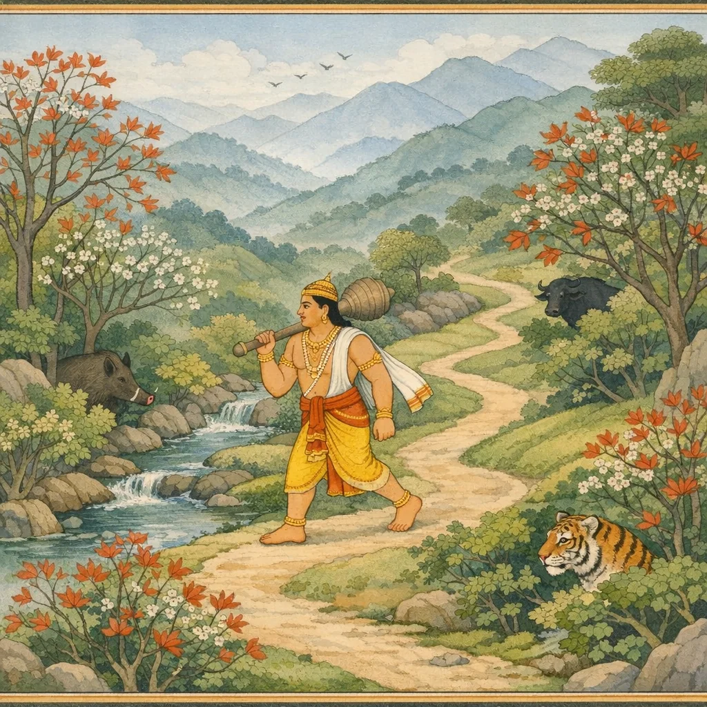 Chapter Arc: हनुमान के अद्भुत विराट रूप और अनुपम तेज का स्मरण करते हुए बलवान भीमसेन उसी मार्ग से आगे बढ़ते हैं—द्रौपदी के वचन उनके लिए पाथेय बन जाते हैं। → सौगन्धिक वन की चाह में भीम रमणीय वनों, उपवनों, सरोवरों और पुष्पित शिखरों को निहारते हुए आगे बढ़ते हैं; मार्ग वन्य पशुओं (महिष, वराह, शार्दूल) से भरा है, पर वे शौर्य से निर्भय होकर पर्वतीय अरण्य में प्रवेश करते हैं। → फूलों की अनन्त सुगन्ध और लाल-लाल कोमल पल्लवों से मानो ‘याचना’ करते वृक्षों के बीच, भीम का मन-नेत्र पुष्पित गिरिशिखरों में डूब जाता है—लक्ष्य (सौगन्धिक) और प्रेरणा (द्रौपदी) एक साथ तीव्र हो उठते हैं। → सौगन्धिक वन को देखकर भीम मन ही मन ‘लब्धकाम’ अनुभव करते हैं और वनवास से क्लिष्ट अपनी प्रिया द्रौपदी को स्मरण कर, शीघ्रतर गति से आगे बढ़ते हैं। → सौगन्धिक-हरण की यात्रा अब निर्णायक मोड़ पर है—आगे वन की रक्षा करने वाली शक्तियों/अवरोधों से सामना होने का संकेत।