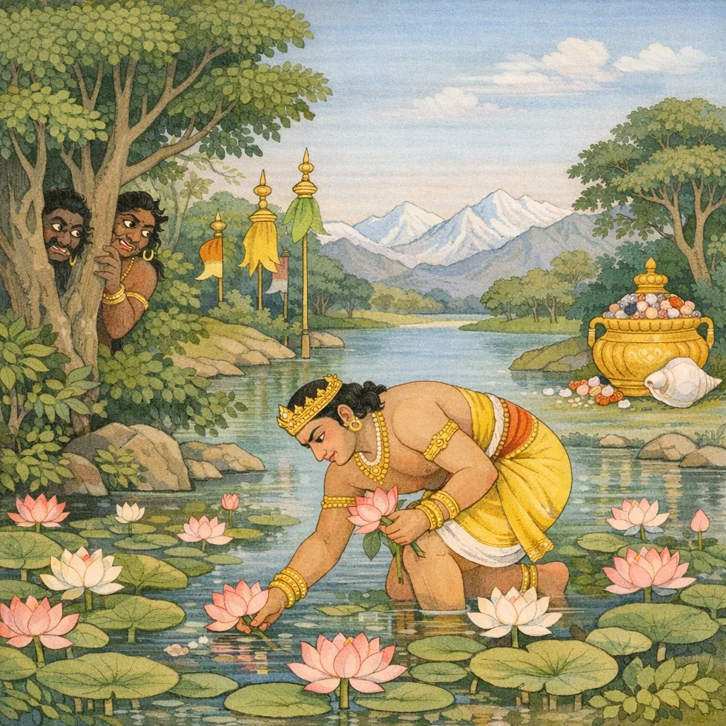 Chapter Arc: वनवास की कठोरता के बीच द्रौपदी की दृष्टि सौगन्धिक कमलों पर पड़ती है—उनकी सुगन्ध और दुर्लभता इच्छा को जगा देती है, और वही इच्छा भीमसेन के लिए प्रतिज्ञा बन जाती है। → भीम द्रौपदी के प्रिय पुष्पों के लिए आगे बढ़ता है, पर मार्ग में ‘नामक’ राक्षसों का दल उसे रोकता है। वे अधिकार, मर्यादा और भय दिखाकर उसे लौटाना चाहते हैं; भीम अपने परिचय और उद्देश्य को स्पष्ट करता है—यह पुष्पाहार धर्मपत्नी के लिए है। फिर भी टकराव बढ़ता है और बल-पराक्रम की परीक्षा सामने आ खड़ी होती है। → भीमविक्रम राक्षसों की रोक को तुच्छ मानकर उन पर टूट पड़ता है—उन्हें कदर्थित कर देता है और उनकी सामूहिक रोक-टोक को चीरकर आगे निकल जाता है। इसके बाद यक्षराज (कुबेर) के सरोवर पर पहुँचकर, आज्ञा/मर्यादा की शर्त के बीच, वह अमृत-कल्प जल पीता है और सौगन्धिक कमलों को उखाड़कर संग्रह करता है। → राक्षस कुबेर की अनुमति लेकर लौटते हैं; भीम को सरोवर में निर्भय, यथोपजोष विहरते देखते हैं। कुबेर की आज्ञा से बाधा हटती है और द्रौपदी के लिए पुष्प-संग्रह का उद्देश्य सिद्ध होता है—भीम की शक्ति अब अनुशासन/अनुमति के साथ संयत रूप लेती है। → कुबेर के क्षेत्र में भीम की इस निर्भीकता का आगे क्या परिणाम होगा—क्या यक्षराज स्वयं साक्षात् होकर भीम से संवाद/परीक्षा करेगा?