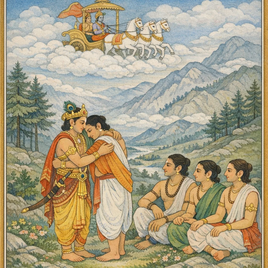 Chapter Arc: स्वर्ग-यात्रा और असुर-वध के बाद दिव्य रथ पर आरूढ़ किरीटधारी अर्जुन गन्धमादन पर्वत की ओर उतरता है—आकाश को प्रकाशित करता हुआ मातलि-चालित रथ मानो मेघों में धधकती महोल्का हो। → पाण्डवों के मन में उत्कंठा और आशंका साथ-साथ उठती है—अर्जुन क्या वरदान और दिव्यास्त्र लेकर लौटा है, और क्या वह वही अर्जुन है जो तपस्या को गया था? दिव्य तेज, नये आभूषण, और इन्द्र-सम वैभव उसके आगमन को असाधारण बना देते हैं। → अर्जुन का धर्मराज युधिष्ठिर को प्रणाम और भाइयों से पुनर्मिलन—समागतों का ‘परम प्रहर्ष’—यही अध्याय का शिखर है; स्वर्ग-प्रवास और देवताओं की प्रसन्नता का संक्षिप्त वृत्तान्त भी यहीं उद्घाटित होता है। → मातलि पाण्डवों का अभिनन्दन कर पिता-वत कर्तव्य-शिक्षा देता है और फिर अपने अनुपम, कान्तिमान रथ सहित लौट जाता है; अर्जुन अपने भाइयों के साथ आश्रम-आवास में विश्राम करता है। → अर्जुन के स्वर्ग-प्रवास से प्राप्त सामर्थ्य और दिव्यास्त्र अब वन-जीवन के आगामी संकटों में कैसे निर्णायक बनेंगे—यह संकेत देकर कथा आगे के संघर्षों की ओर मुड़ती है।
