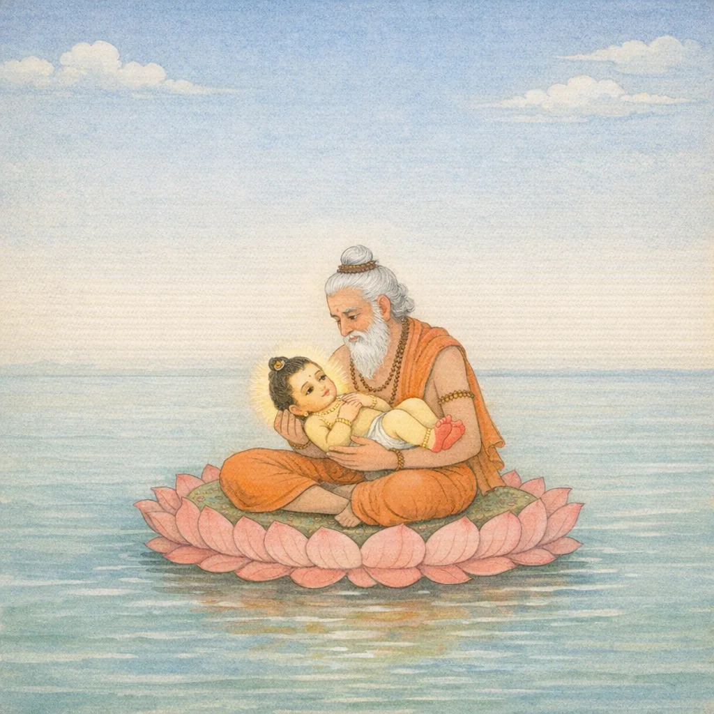 With humility I joined my palms, and with deliberate effort approached him. Then I beheld that lotus-eyed deity—the inner Self of all beings—radiant with immeasurable splendor.