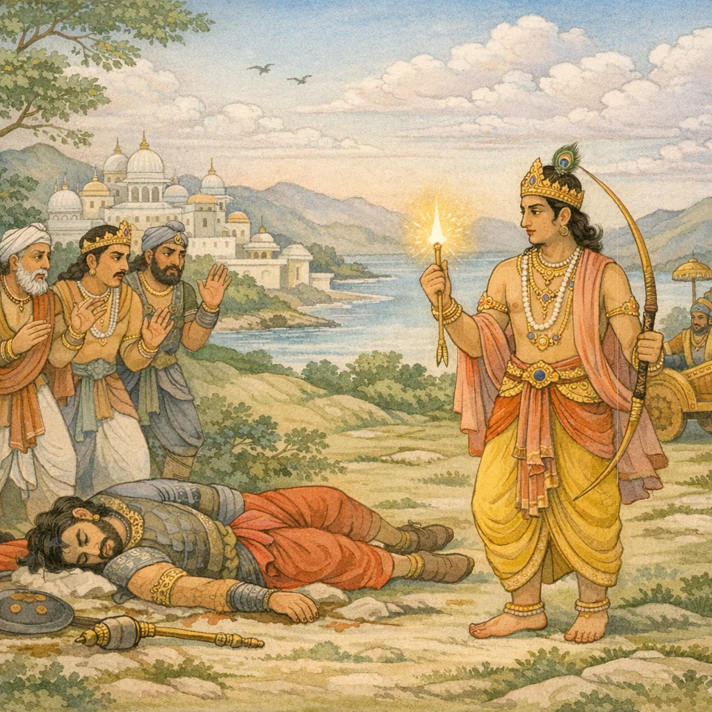 Perceiving that a mighty Daitya-weapon had been set in motion, he intercepted it mid-course with the Brahmāstra, cutting it down; then he released many other arrows. The episode underscores that overwhelming force is to be met not with reckless rage but with discerning, proportionate counter-measures guided by mastery and restraint.
