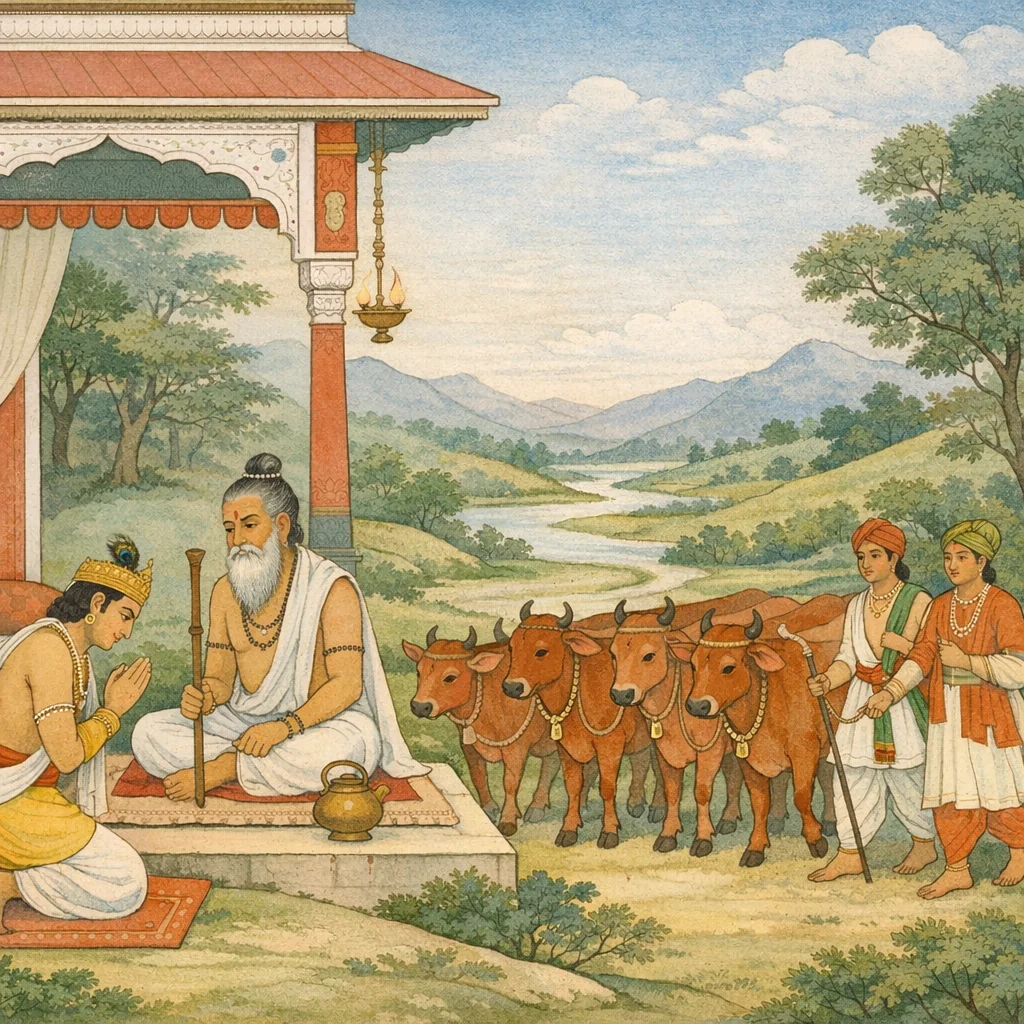Chapter Arc: राजा (शिवि-परंपरा का दानी नरेश) के सामने एक ब्राह्मण याचक-रूप में उपस्थित होता है और ‘भगवन्, अपनी शर्त बताइये’—राजा स्वयं दान-धर्म की कसौटी सुनने को तत्पर हो उठता है। → ब्राह्मण कठोर प्रश्न उठाता है—जीव-लोक में सबसे बड़ा विद्वेष तब होता है जब किसी से ‘प्रिय’ वस्तु माँगी जाए; फिर वह राजा से पूछता है कि यदि अत्यन्त दयित वस्तु माँगी जाए तो राजा क्या देगा। यह चुनौती दान की मात्रा नहीं, आसक्ति-त्याग की परीक्षा बन जाती है। → राजा घोषणा करता है कि वह दान देकर उसका बखान नहीं चाहता, न ही अनधिकृत को देता है; पर जो याचना करके माँगे, उसे वचन देकर प्रसन्नता से देता है—और तत्क्षण ‘रोहिणी’ वर्ण की एक सहस्र गौएँ ब्राह्मण को देने का निश्चय करता है। → राजा ब्राह्मण को एक हजार गौएँ दान कर देता है; ब्राह्मण दान प्राप्त कर लेता है। कथा दान के शुद्ध भाव—अहंकार-रहित, शोक-रहित, क्रोध-रहित—को स्थापित करती है। → याचक की परीक्षा-प्रकृति और आगे की माँगें (यदि हों) क्या होंगी—यह जिज्ञासा बनी रहती है।