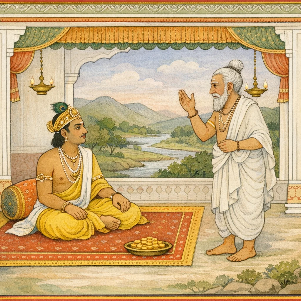 The Brahmin said: “O emperor among kings, I have come to your presence to beg, having been sent by Seduka. In accordance with his instruction, I have begged from you.” Having said this, the king granted the Brahmin the day’s divinely allotted income—indeed, he gave an amount exceeding even the value of a thousand horses. The episode highlights royal duty expressed as generosity: the ruler’s wealth is to be used to relieve need, and a petitioner’s request, properly conveyed, becomes an occasion for dharmic giving rather than mere transaction.