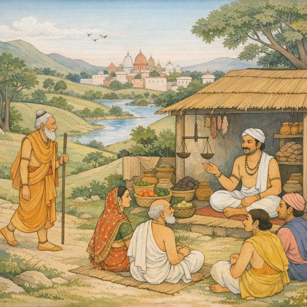 Mārkaṇḍeya said: He saw the ascetic selling the flesh of boars and buffaloes. And because the customers were crowding about in confusion, the brāhmaṇa stood apart in a secluded spot. The scene underscores a central Mahābhārata tension: outward occupation may appear impure, yet dharma is to be judged by conduct, intention, and right understanding rather than by mere social appearance.