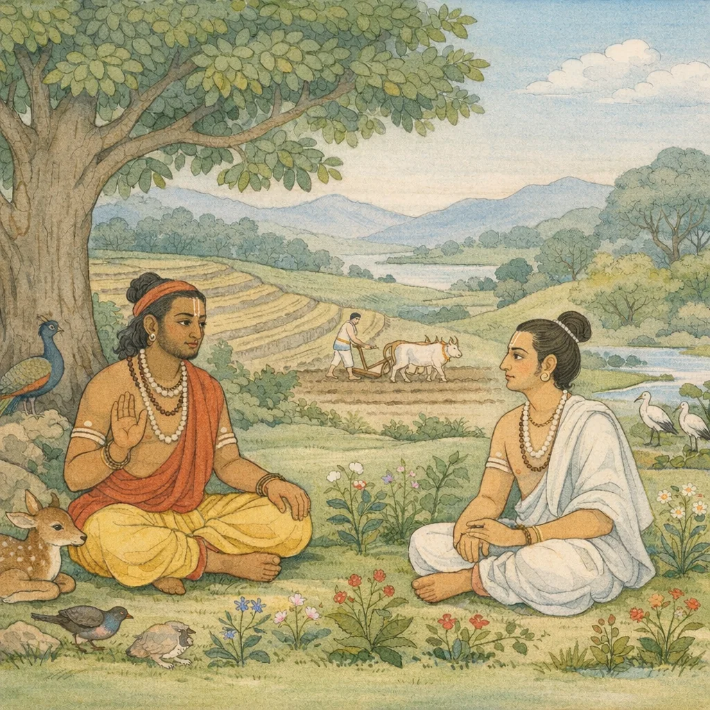 Chapter Arc: धर्मव्याध के समक्ष ब्राह्मण के मन में एक तीखा संशय उठता है—यदि अहिंसा परम धर्म है, तो संसार के नित्य कर्मों में सर्वत्र हिंसा क्यों दीखती है, और फिर ‘दैव’ (पूर्वकर्म) इतना बलवान क्यों है? → व्याध ‘विधि’ और ‘पुराकृत कर्म’ की दुस्तरता का संकेत देकर प्रश्न को और गहरा करता है: कृषि, भोजन, पशु-आहार, वृक्ष-औषधि-छेदन—जीवन-यापन के साधनों में भी असंख्य प्राणियों का विनाश होता है। साथ ही वह सामाजिक उलटबांसियों की ओर भी उंगली उठाता है—मित्र-मित्र को, शत्रु-शत्रु को, बन्धु-बन्धु को भी ठीक से नहीं देखते; समृद्धि से ईर्ष्या, गुरु-निन्दा, और पण्डितमान का मोह व्याप्त है। → कृषि और सामान्य कर्मों में ‘पराहिंसा’ का प्रत्यक्ष चित्र खड़ा कर (भूमिशायी जीवों का मरण, पशु-वध, वृक्ष-औषधि-छेदन) व्याध ब्राह्मण को धर्म के सूक्ष्म विवेक पर ला खड़ा करता है—जब धर्म-अधर्म लोक में उलटे दिखते हैं, तब निर्णय का आधार क्या हो? → व्याध निष्कर्ष की दिशा देता है: धर्म-अधर्म पर बहुत कहा जा सकता है, पर जो मनुष्य अपने स्वधर्म/स्वकर्म में सम्यक् प्रवृत्त रहता है, वही महायश पाता है—अर्थात् कर्म-निष्ठा, विवेक, और यथाशक्ति दोष-परिहार ही व्यावहारिक मार्ग है। → स्वकर्म-निष्ठा का मानदण्ड तो मिला, पर ब्राह्मण के भीतर यह प्रश्न शेष रहता है कि ‘अनिवार्य हिंसा’ वाले कर्मों में दोष-क्षय और अहिंसा का सर्वोच्च रूप कैसे साधा जाए?