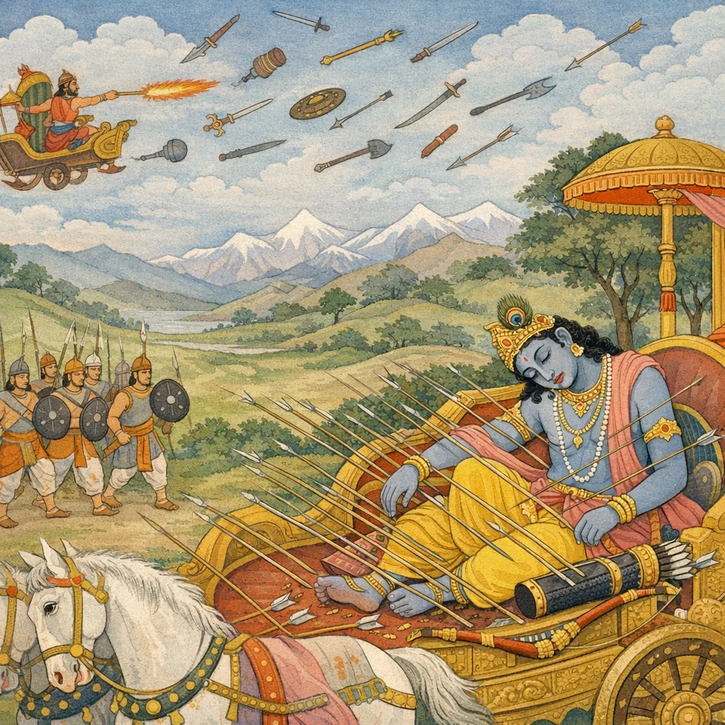 Chapter Arc: सौभ-वध की कथा आगे बढ़ती है—शाल्व क्रोध में अन्धाधुन्ध अस्त्रों की वर्षा करता है और कृष्ण के रथ पर भीषण आघात पड़ता है। → शाल्व शतघ्नियाँ, गदाएँ, शूल, मुसल और असि फेंकता है; कृष्ण आकाश में ही तीव्र बाणों से उन्हें काट-काटकर निष्फल करते हैं। फिर शाल्व लाखों झुकी-गाँठ वाले बाणों से दारुक, घोड़ों और रथ को ढँक देता है; घावों से रक्त बहता है और रण का कोलाहल बढ़ता जाता है। → माया-प्रयोग से कृष्ण पर मोह छा जाता है—उनका शार्ङ्ग धनुष हाथ से गिर पड़ता है और वे रथोपस्थ पर बैठ जाते हैं; शत्रु-सैनिक शूल-पट्टिश लिए झपटते हैं, और क्षण भर को विजय का पलड़ा शाल्व की ओर झुकता दिखता है। → कुछ ही समय बाद कृष्ण को संज्ञा लौटती है; वे समझ जाते हैं कि यह माया है। जाग्रत होकर वे पुनः शतशः बाणों की वर्षा करते हैं और शाल्व की छल-छाया को भेदने का संकल्प दृढ़ करते हैं। → माया का आवरण हटते ही कृष्ण का प्रत्याघात आरम्भ होता है—अब शाल्व और सौभ-नगर पर निर्णायक प्रहार किस रूप में पड़ेगा?