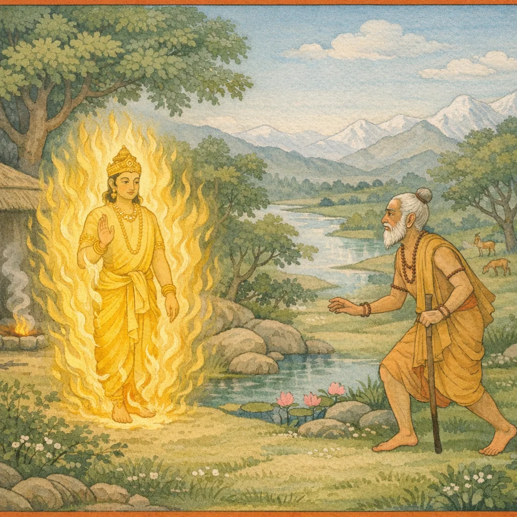 He beheld the great sage, blazing like fire and heating all the worlds. And he reflected: “It seems that, through my absorption in austerity (tapas), my very nature as fire has been lost. How now may I become fire again?”
