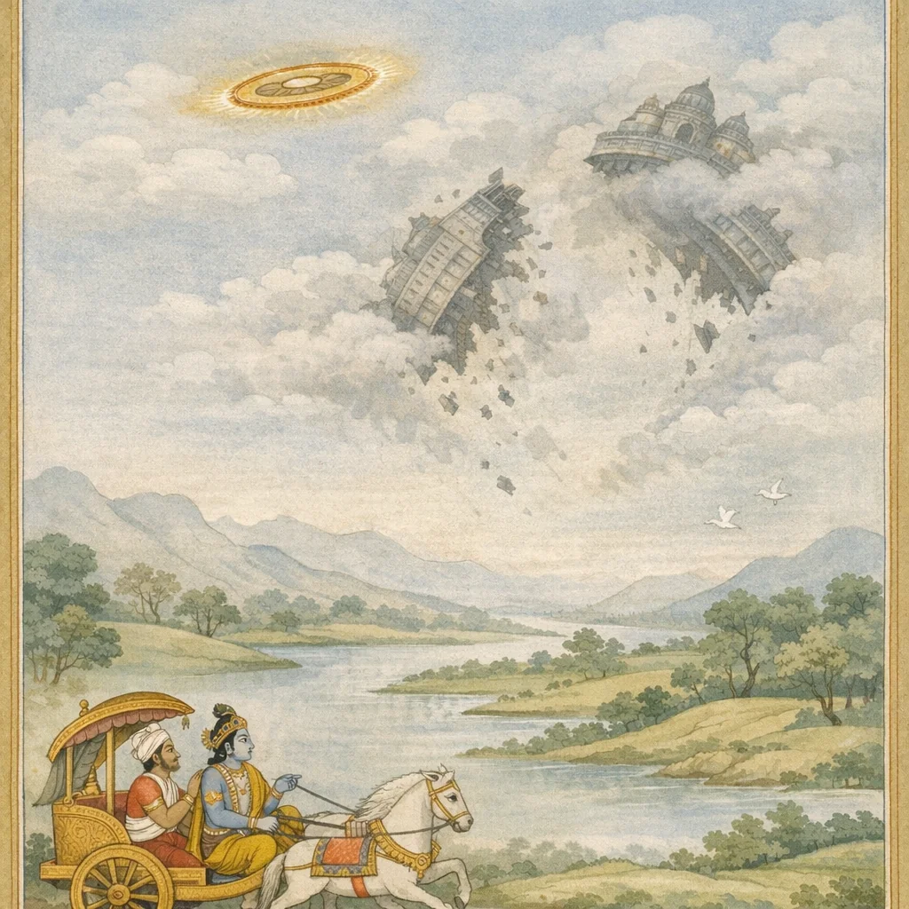 Chapter Arc: सौभविमान-वध की गाथा के धुएँ और तेज के बीच कथा खुलती है—शाल्व पर छोड़े गए सर्प-सदृश विषबाण, और फिर मायावी सौभ का अचानक अदृश्य हो जाना, जिससे वीर भी क्षणभर को विस्मित रह जाए। → माया-आवरण के कारण लक्ष्य लुप्त है; रथ-घोड़े पर्वत-भार से दबे, प्राण-क्षीण और लड़खड़ाते दिखते हैं। सारथि दारुक तात्कालिक सलाह देता है, और कृष्ण क्षण-भर ठहरने का आदेश देकर दिव्य, अभेद्य प्रतिरोध के बीच निर्णायक प्रहार का अवसर साधते हैं। → सुदर्शन-चक्र की अचूक शक्ति से सौभविमान त्रिपुर के समान चूर होकर द्विधा गिरता है; उसी तेजस्वी वेग में गदा घुमाते शाल्व को भी चक्र सहसा दो भागों में कर देता है—युद्ध का मायावी शिखर एक क्षण में कट जाता है। → उपाख्यान का परिणाम स्पष्ट है—माया पर धर्म-तेज की विजय। इसके बाद दृश्य बदलता है: काम्यक वन में युधिष्ठिर के राज्य/आश्रय से जुड़े ब्राह्मण-वैश्य पाण्डवों को छोड़ने को तैयार नहीं; अंततः युधिष्ठिर उनकी अनुमति लेकर सेवकों को रथ जोतने का आदेश देते हैं। → काम्यक वन का वह ‘अद्भुत समवाय’ समाप्ति की ओर है—रथ जुड़ रहे हैं; पाण्डवों की अगली गति और वन-यात्रा का अगला मोड़ सामने खड़ा है।