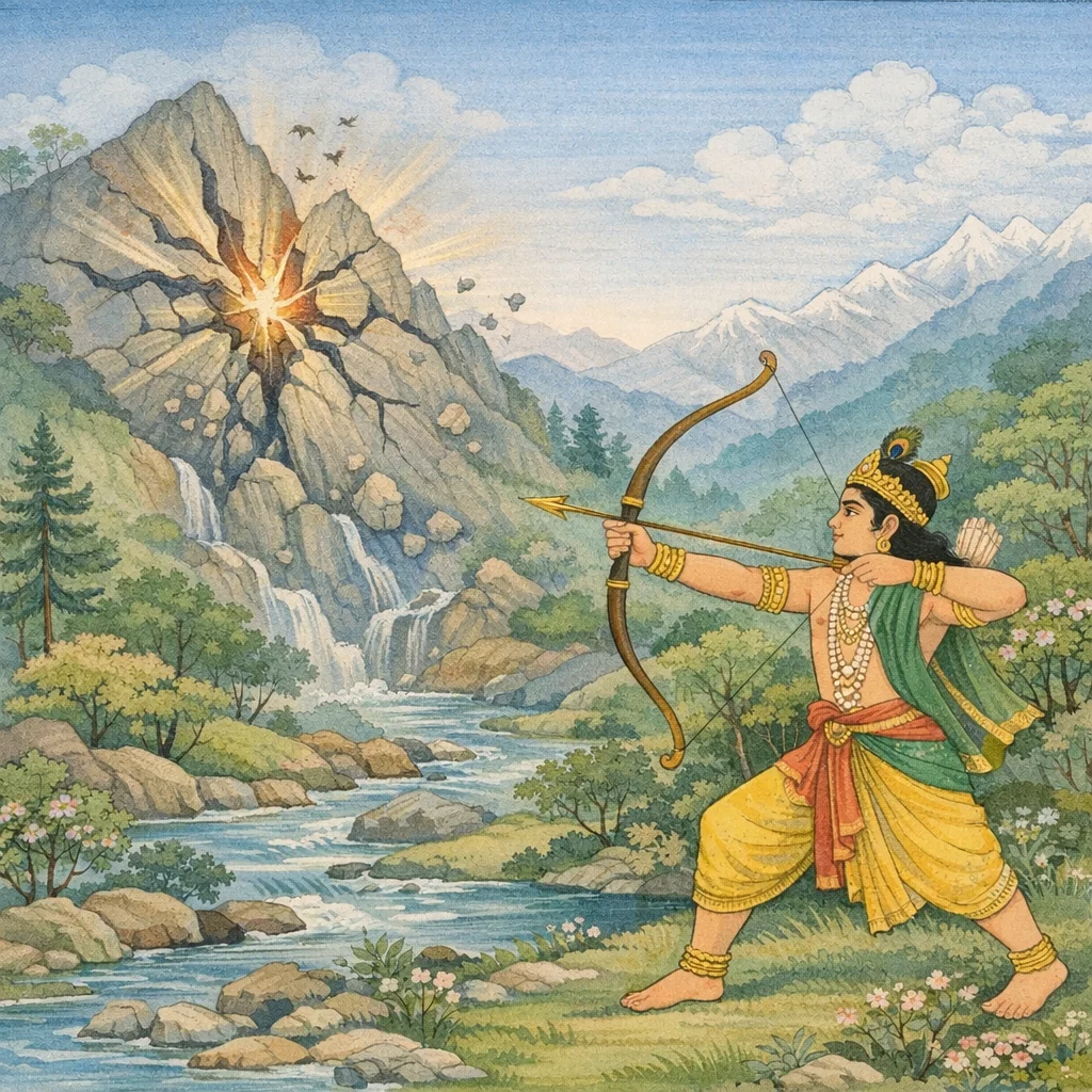 Then the mighty-armed hero rose up; having soothed and reassured those beings, he stood upon the great white mountain and, drawing his bow to the full, began to release a shower of arrows.