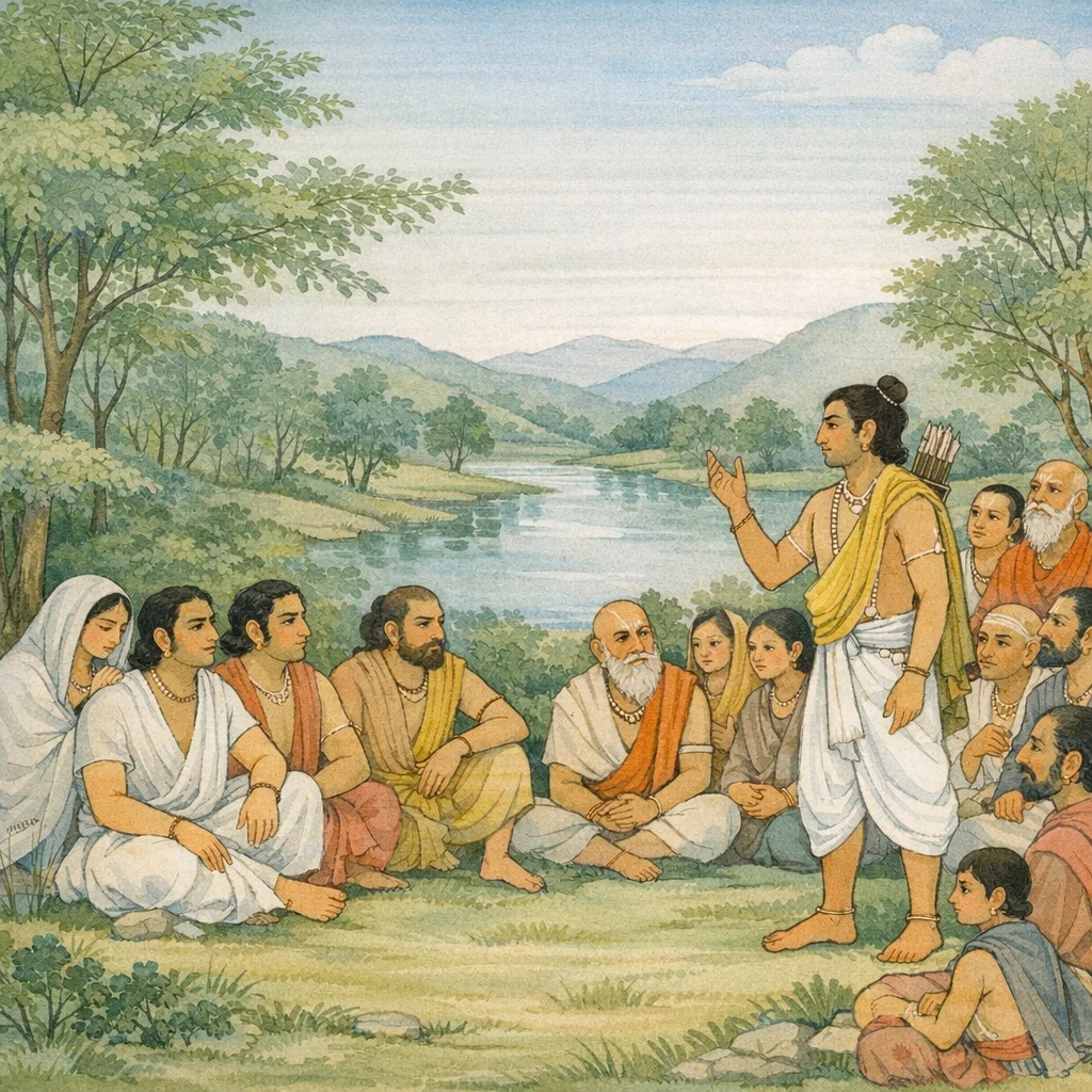 Chapter Arc: सौभवधोपाख्यान के उपरान्त कथा फिर वर्तमान में लौटती है—श्रीकृष्ण के साथ यादव-वीर सुसज्जित होकर वन की ओर प्रस्थान करते हैं, मानो भूतपति (शिव) के समान तेजस्वी। → नगर-जन और जनपद के लोग धर्मराज युधिष्ठिर के वनगमन से व्याकुल हो उठते हैं; वे धृतराष्ट्र, शकुनि और कर्ण को क्रूरबुद्धि कहकर धिक्कारते हैं और पूछते हैं—जिसने इन्द्रप्रस्थ जैसा नगर बसाया, वह धर्मात्मा राजा हमें छोड़कर कहाँ चला गया? → जनसमुदाय का सामूहिक विलाप और आक्रोश चरम पर पहुँचता है—धर्मनिष्ठ राजा के साथ हुए अन्याय को वे सार्वजनिक रूप से धिक्कारते हैं, और युधिष्ठिर के वनप्रवेश को राज्य-धर्म के पतन का संकेत मानते हैं। → अर्जुन के वचनों से ब्राह्मण तथा सभी वर्णों के लोग कुछ क्षण के लिए धैर्य पाते हैं; वे धर्मभूत श्रेष्ठ युधिष्ठिर की प्रदक्षिणा करते हैं। फिर युधिष्ठिर, भीम, अर्जुन, द्रौपदी और यमजों को आमंत्रित कर, अनुमति देकर सब अपने-अपने स्थानों को लौटते हैं—हर्ष-शून्य होकर। → द्वैतवन में प्रवेश के साथ पाण्डवों का वनवास औपचारिक रूप से आरम्भ होता है—आगे वन के कठोर जीवन और आने वाले संकटों की छाया पड़ती है।