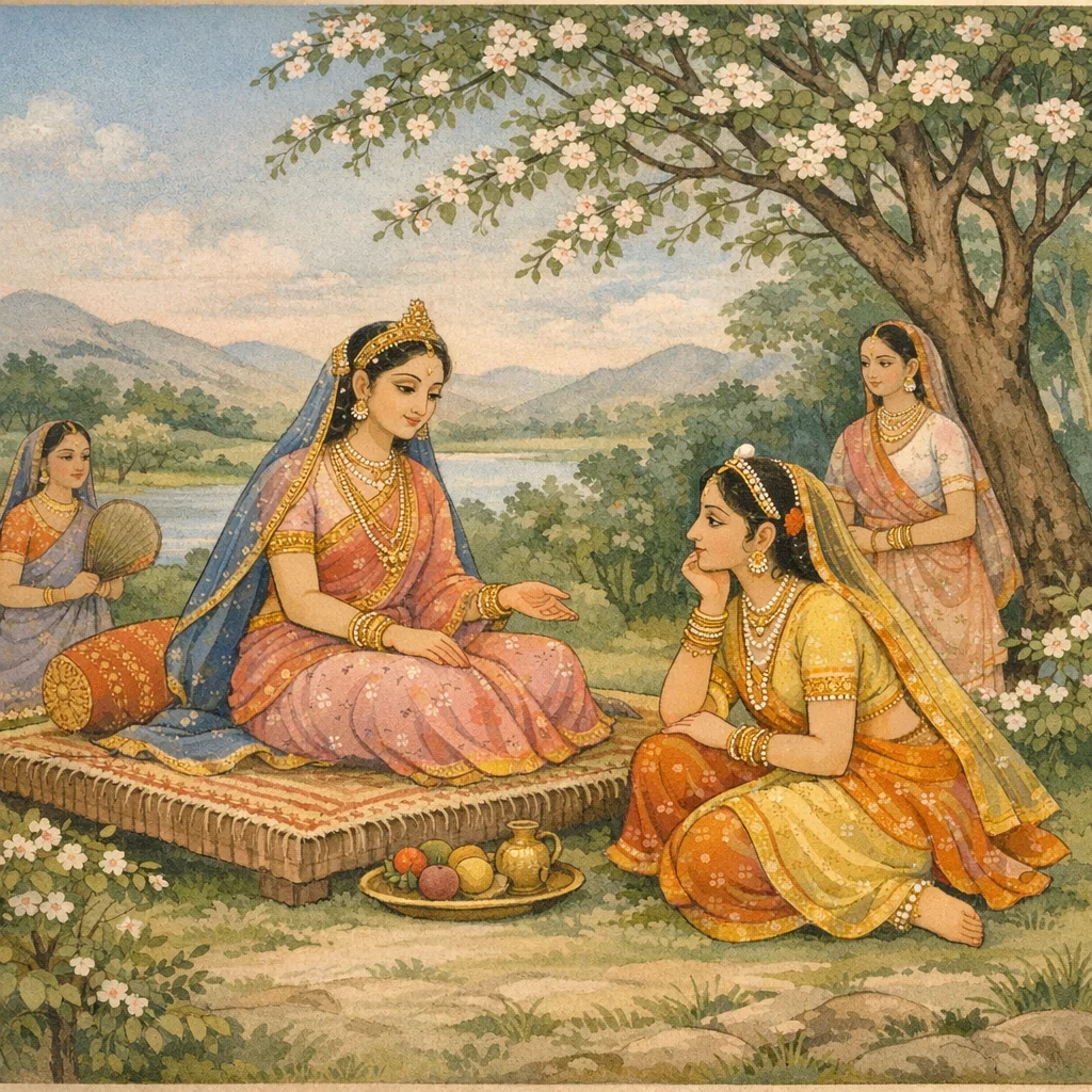 Chapter Arc: जनमेजय के समक्ष वैशम्पायन उस अंतरंग प्रसंग को उठाते हैं जहाँ द्रौपदी और कृष्ण-पत्नी सत्यभामा हँसते-हँसते, स्नेहपूर्वक साथ बैठती हैं और स्त्री-धर्म तथा गृह-धर्म की सूक्ष्म बातें छिड़ जाती हैं। → कुरु और यादव कुलों की विचित्र कथाएँ चलते-चलते सत्यभामा द्रौपदी से पूछती है कि वह कैसे अपने पतियों के प्रिय-हित में निरन्तर रत रहती है—और द्रौपदी परोक्ष रूप से यह दिखाती है कि प्रेम केवल भाव नहीं, सतत अनुशासन और प्रबन्ध भी है। → द्रौपदी अपने ‘नित्यकालमतन्द्रिता’ गृह-धर्म का कठोर, व्यावहारिक रूप खोलती है—सास-ससुर, कुटुम्ब-धर्म, सेवा-शुचिता, तथा घर-राज्य के आय-व्यय, भोग-वस्त्र, सेवक-सेविकाओं और व्यवस्था तक का सूक्ष्म ज्ञान; और यह भी कि पति जिन वस्तुओं का त्याग करते हैं, वह भी वही त्याग देती है। → संवाद का निष्कर्ष यह बनता है कि ‘सती स्त्री’ का कर्तव्य केवल व्रत-उपवास नहीं, बल्कि परिवार-राज्य की मर्यादा, संयम, परिश्रम, और पति-हित में बुद्धिमत्ता से चलाया गया जीवन है—जिससे गृहस्थाश्रम की कीर्ति और स्थिरता टिकती है। → सत्यभामा के मन में द्रौपदी के इस आदर्श-व्यवहार को अपनाने की जिज्ञासा और भी तीव्र होती है—आगे वह इस शिक्षा को अपने जीवन में कैसे उतारेगी, यह संकेत रूप में छोड़ दिया जाता है।