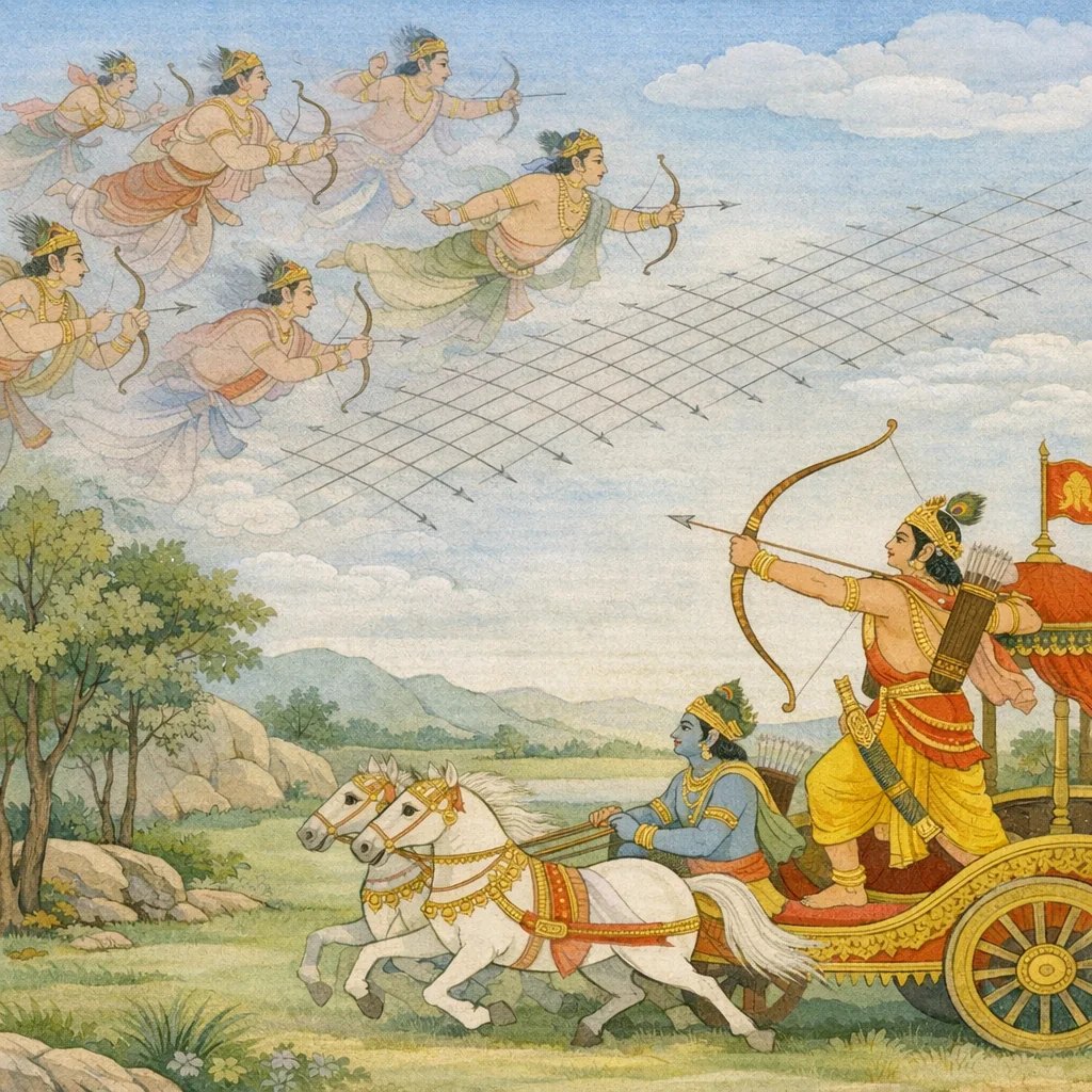 Seeing him become invisible and still striking, Arjuna counterattacked, piercing him with swift, sky-ranging arrows that had been empowered by the mantras of divine weapons—meeting hidden aggression with disciplined, consecrated force rather than panic or cruelty.