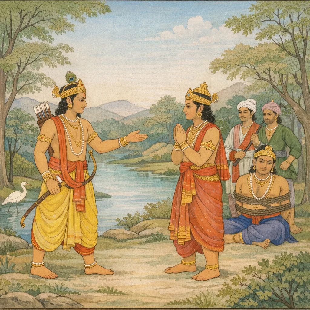 Chapter Arc: द्वैतवन में गन्धर्वों द्वारा पकड़े गए दुर्योधन का समाचार पाण्डवों तक पहुँचता है—और प्रश्न उठता है: शत्रु होकर भी ‘भाई’ को अपमानित अवस्था में छोड़ देना क्या धर्म है? → अर्जुन चित्रसेन से पूछता है कि कौरवों को रोकने का निश्चय क्या है और दुर्योधन को सपरिवार क्यों बाँधा गया। चित्रसेन बताता है कि इन्द्र ने दुर्योधन-कर्ण की द्रौपदी-उपहास की योजना जानकर उसे दण्ड देने को कहा; गन्धर्वों ने उसी हेतु उन्हें दबोचा। → अर्जुन चित्रसेन से विनय-आदेश करता है—‘यदि धर्मराज का संदेश और मेरा प्रिय करना चाहते हो तो हमारे भाई सुयोधन को छोड़ दो।’ यहाँ अर्जुन का क्षात्र-तेज और भ्रातृभाव, दुर्योधन के अपराध-दण्ड के सामने खड़ा हो जाता है। → युधिष्ठिर के पास जाकर सब घटना निवेदित होती है; दुर्योधन को मुक्त किया जाता है। चित्रसेन देवलोक जाकर इन्द्र को समस्त वृत्तान्त कहता है; इन्द्र दिव्य अमृत-वर्षा से गन्धर्वों के मृत साथियों को पुनर्जीवित करता है। दुर्योधन लज्जित-विदीर्ण होकर नगर की ओर लौटता है, और पाण्डव द्वैतवन में तपस्वियों सहित शांत भाव से विहार करते हैं। → दुर्योधन की अपमान-जनित लज्जा और क्रोध अब किस प्रतिशोध-योजना में ढलेगा—यह आगे की कथा के लिए बीज बनकर रह जाता है।