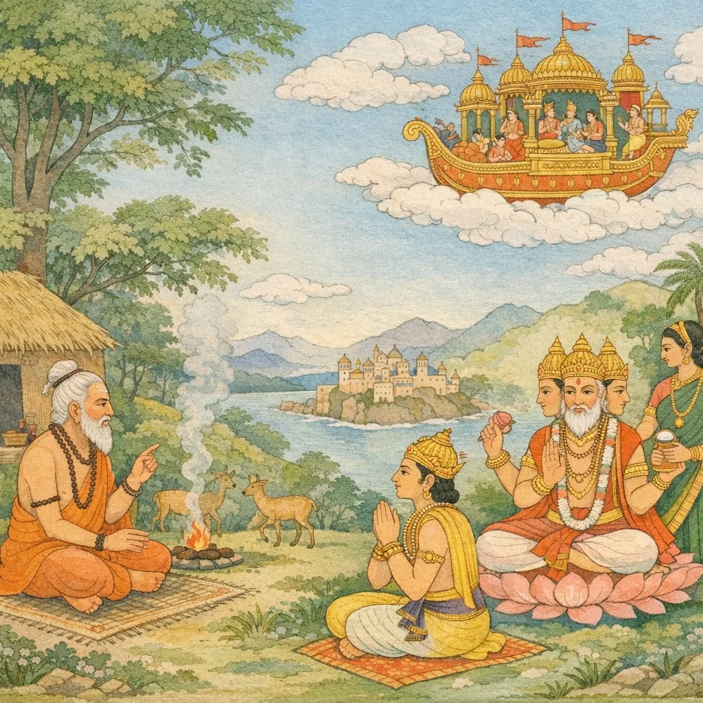Mārkaṇḍeya said: The Lord granted him the aerial car named Puṣpaka, able to move wherever one wished. He also bestowed upon him sovereignty over the Yakṣas and the very status of ‘Rājarāja’—king among kings—thus establishing Kubera’s divinely sanctioned authority and prosperity.