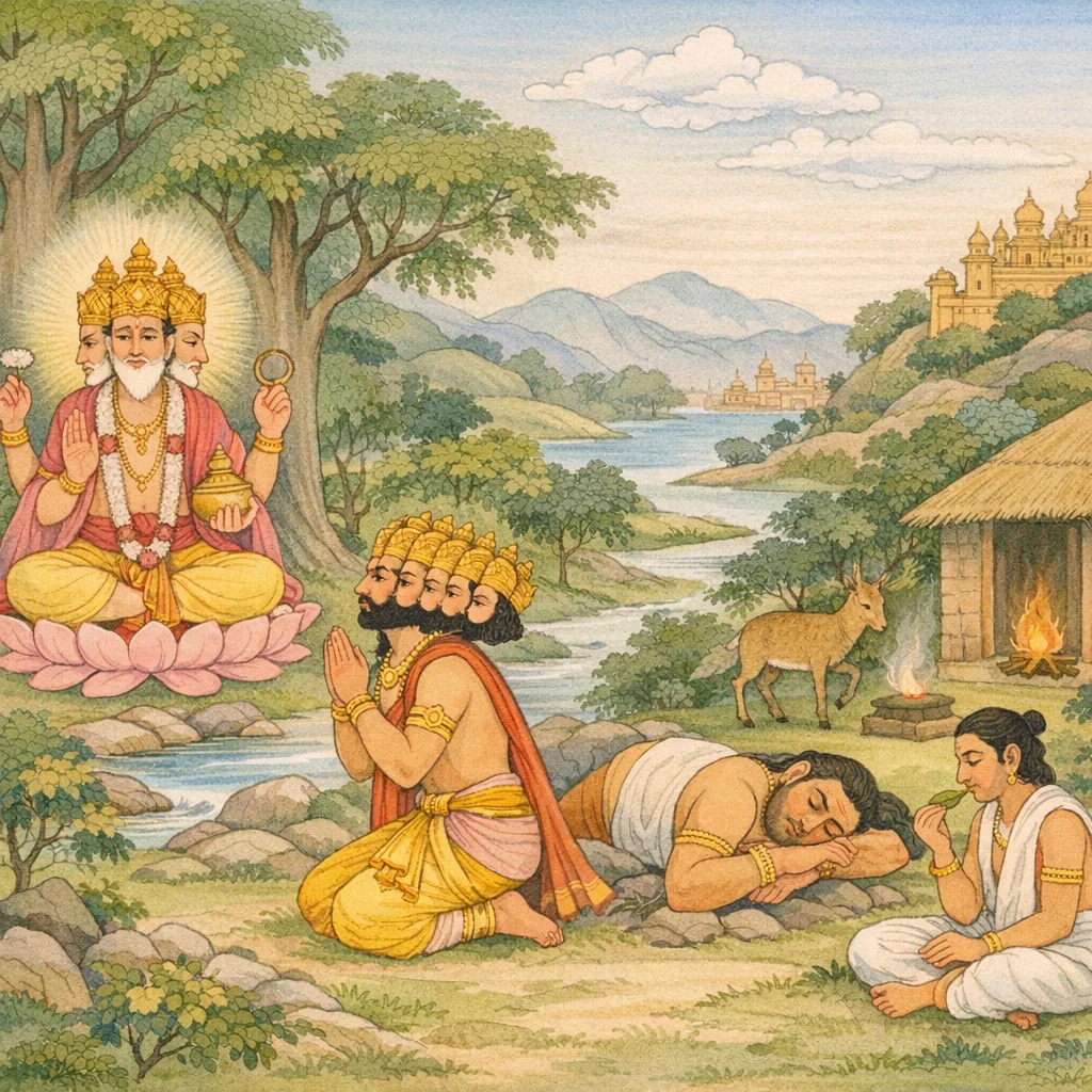 Brahmā said: “I am pleased with you. Now cease your austerities and return; choose your boons, dear sons. Whatever you desire shall be granted—except for one thing: immortality. That shall not be.”