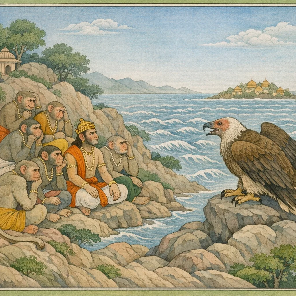 Chapter Arc: राम के मन में संशय और आत्म-प्रश्न उठता है—क्या वह शत्रुओं का वध कर, वैदेही को मुक्त कर, फिर अयोध्या लौटकर राज्य कर पाएगा; इसी व्याकुलता के बीच हनुमान आगे बढ़कर निर्णायक समाचार देने को उद्यत होता है। → हनुमान वानर-दल की दक्षिण दिशा में की गई कठिन खोज-यात्रा का वृत्तांत सुनाते हैं—पर्वत-वन-आकरों से भरी दिशाएँ, समय का बीतना, थकान, महागुहा का भय, मलयाचल से समुद्र का विराट विस्तार देखकर निराशा; फिर सम्पाति-जटायु-स्मृति और उससे जुड़ा संकेत दल को नई दिशा देता है। → सम्पाति का उत्साहवर्धक वचन—वह रावण और लंका का ज्ञान रखता है और निश्चयपूर्वक कहता है कि वैदेही वहीं है; इसी क्षण वानर-सेना का टूटता मन जुड़ता है और समुद्र-लांघने का संकल्प जन्म लेता है। → समुद्र-क्रमण के विषय में वानर परस्पर मंत्रणा करते हैं; आगे चलकर हनुमान लंका में सीता के निकट पहुँचकर अपना परिचय देते हैं—‘प्रत्यय करो, मैं वानर हूँ, राक्षस नहीं’—और सुग्रीव तथा राम की कुशल-पूछ का संदेश देकर विश्वास की नींव रखते हैं। → समुद्र पार करने और लंका में प्रवेश के बाद भी निर्णायक प्रश्न शेष है—क्या सीता हनुमान पर पूर्ण विश्वास करेगी, और क्या यह संदेश-सेतु राम के प्रतिशोध और उद्धार-यात्रा को तुरंत गति देगा?