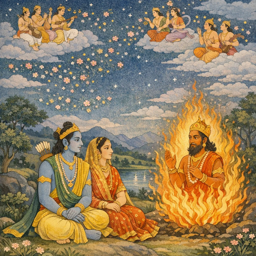 Chapter Arc: दशग्रीव के वध के पश्चात् आकाश देव-गन्धर्वों से भर उठता है; पुष्पवृष्टि और जय-आशीर्वादों के बीच विजयी राम के सामने एक नया, अधिक सूक्ष्म संकट खड़ा होता है—लोक-निन्दा का भय और सीता की शुद्धि पर संदेह। → देवताओं का स्तवन, गन्धर्वों की पुष्पवृष्टि और शरद्-नभ के समान उज्ज्वल अन्तरिक्ष के बीच भी राम का मन स्थिर नहीं होता; सीता अपने पतिव्रत और निष्कलुषता का निवेदन करती है, पर ‘लोक क्या कहेगा’ की छाया निर्णय को कठोर बनाती जाती है। → अग्निदेव स्वयं साक्षी बनकर उद्घोष करते हैं कि मैथिली निर्दोष है—‘अहमन्तःशरीरस्थो… मैथिली नापराध्यति’; देव-समाज द्वारा सीता की शुद्धि का समर्थन राम के संदेह-ताप को निर्णायक रूप से तोड़ देता है। → राम देवताओं को नमस्कार कर, सुहृदों से अभिनन्दित होकर सीता से पुनर्मिलन करते हैं; तत्पश्चात् दल-बल सहित लंका से प्रस्थान, समुद्र-तट पर विश्राम, हनुमान द्वारा नन्दिग्राम में भरत को शुभ-संदेश, और अयोध्या-गमन की दिशा स्पष्ट होती है। → अयोध्या में भरत की प्रतीक्षा और ‘भूमि के रहने तक’ राम-कीर्ति के लोक-प्रसार का संकेत—विजय के बाद राज्य-धर्म और लोक-मत की अगली परीक्षा निकट है।