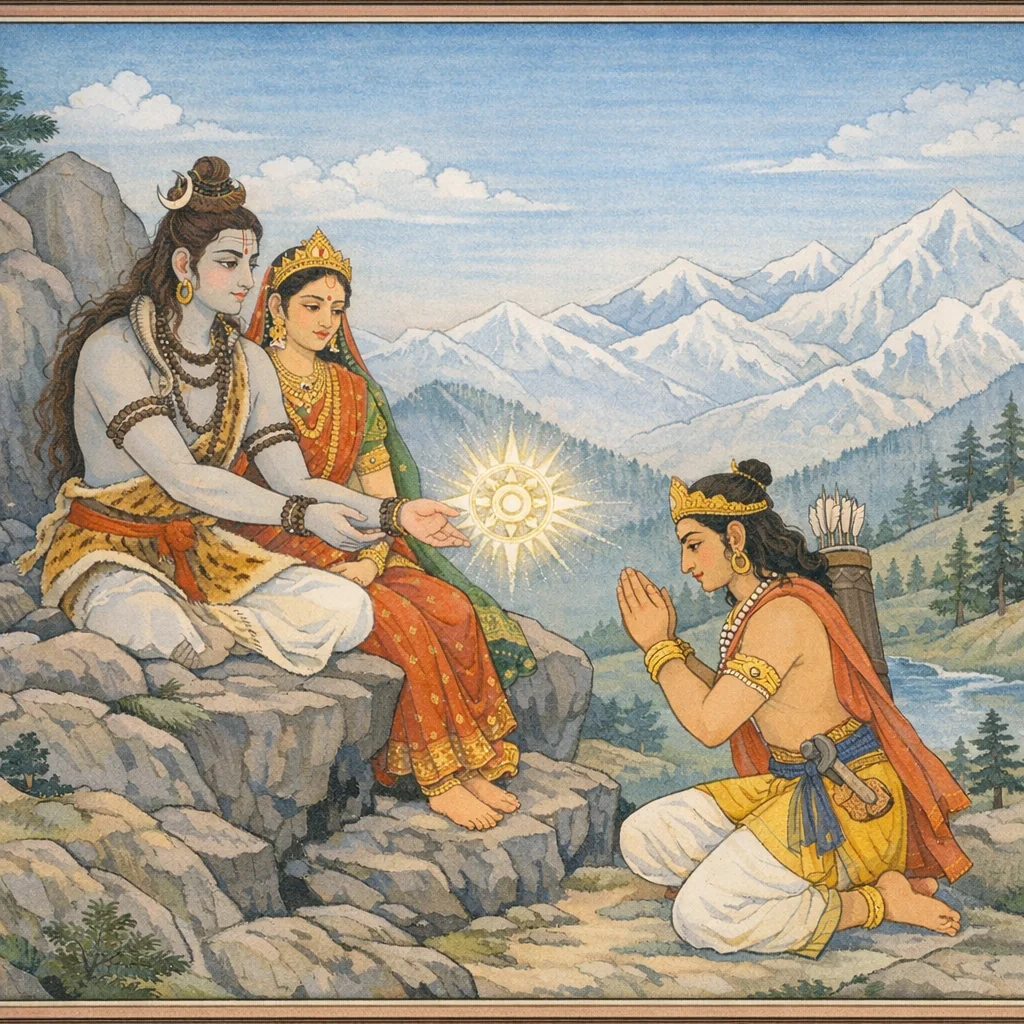 Chapter Arc: किरात-वेषधारी महादेव अब अपना रहस्य-स्वरूप प्रकट कर अर्जुन के तप की परीक्षा का फल सुनाते हैं—और देवदेव स्वयं वर देने को उद्यत होते हैं। → शिव अर्जुन की पूर्वजन्म-स्मृति और उसके नारायण-सहचर होने का संकेत देकर उसके तेज का महत्त्व बताते हैं—यह तेज साधारण नहीं, जगत्-धारण करने वाले पुरुषश्रेष्ठों का अंश है। फिर भी, ऐसा वर यदि मिला तो उसका भार और मर्यादा भी उतनी ही कठोर होगी। → अर्जुन विनयपूर्वक ‘घोर’ दिव्यास्त्र—पाशुपत—की याचना करता है, जिससे दानव, राक्षस, भूत-पिशाच, गन्धर्व, नाग आदि का दमन हो सके। शिव प्रसन्न होकर पाशुपतास्त्र प्रदान करते हैं, पर साथ ही उसका भयावह निषेध भी देते हैं—अल्पतेज या अनुचित लक्ष्य पर प्रयोग हुआ तो वह जगत्-विनाशक बन सकता है। → महादेव अर्जुन को महान धनुष (गाण्डीव का उल्लेख/प्रशंसा-प्रसंग) और दिव्य सामर्थ्य का आश्वासन देकर वरदान-सम्पन्न करते हैं। अर्जुन के देखते-देखते शिव उमा सहित हिम-शिखरों, श्वेत तटों और कन्दराओं वाले शुभ पर्वत-प्रदेश को त्यागकर अपने धाम की ओर प्रस्थान करते हैं। → अर्जुन के हाथ में अब ऐसा अस्त्र है जो युद्ध का भाग्य बदल सकता है—पर प्रश्न यह है कि वह इसे कब, किस पर, और किस धर्म-सीमा में प्रयोग करेगा।