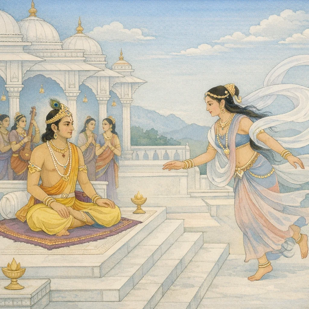 Urvashi said: “O best of men, just as Chitrasena conveyed it to me, so will I tell you in full—both the message and the purpose for which I have come here.”