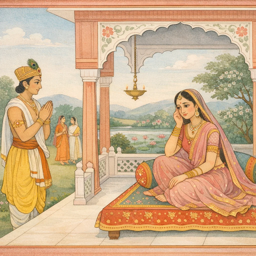 Chapter Arc: देवताओं के दूत-रूप में पहुँचा नल दमयन्ती के अंतःपुर में संवाद आरम्भ करता है—एक ओर स्वयंबर की घड़ी निकट, दूसरी ओर लोकपालों की अदृश्य उपस्थिति का भय। → नल, देवताओं की ओर से, दमयन्ती को लोकपालों का वरण करने का संकेत देता है; दमयन्ती अपने सर्वस्व-समर्पण और हंसों के वचनों से जगी प्रेमाग्नि का उल्लेख कर नल के प्रति अपनी अडिग निष्ठा प्रकट करती है। → दमयन्ती अश्रुपूरित नेत्रों और काँपती वाणी से निर्णायक प्रतिज्ञा करती है कि वह लोकपालों के सामने ही नल का वरण करेगी—ताकि देवताओं का अपमान भी न हो और उसका धर्म-संकल्प भी न टूटे। → नल दमयन्ती के निश्चय और उसके धर्मयुक्त उपाय को सुनकर संदेश को यथावत देवताओं तक पहुँचाने का वचन देता है; फिर लौटकर त्रिदशों के समक्ष दमयन्ती का वृत्तान्त निवेदित करता है। → स्वयंबर में जब लोकपाल भी उपस्थित होंगे और नल भी—दमयन्ती नल को कैसे पहचानकर वरण करेगी?