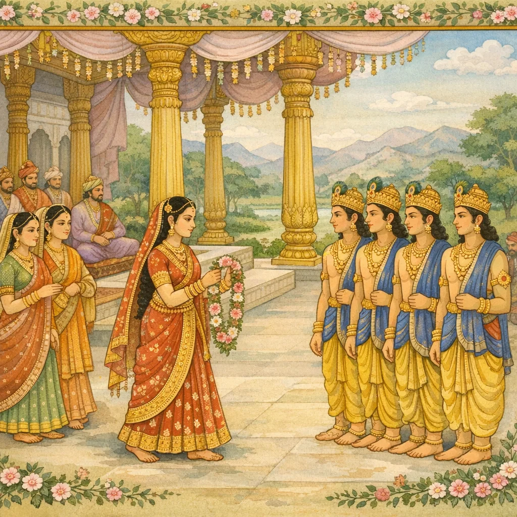 Chapter Arc: दमयन्ती के स्वयंवर का समाचार चारों दिशाओं में फैलते ही काम-पीड़ित राजाओं का हृदय धड़क उठता है; वे उसे पाने की उत्कंठा में शीघ्र विदर्भ की ओर दौड़ पड़ते हैं। → स्वर्ण-स्तम्भों और तोरणों से सुसज्जित रंगमण्डप में राजाओं और देवताओं का आगमन होता है। दमयन्ती के मन में नल के प्रति अटल प्रेम है, पर देवता भी नल का ही रूप धारण कर लेते हैं—एक ही रूप के अनेक प्रतिबिम्बों में वह अपने वर को कैसे पहचाने? वह बार-बार विचार करती है कि ‘एक भी पृथक् चिह्न नहीं दिखता’। → दमयन्ती सत्य-प्रतिज्ञा और देव-नियति का स्मरण कर देवताओं से प्रार्थना करती है कि यदि नल ही उसके लिए निश्चित हैं तो वे उसी को उसके सामने प्रकट कर दें। देवता उसके सत्य और धैर्य से प्रसन्न होकर नल को पहचानने योग्य संकेत देते हैं; दमयन्ती नल का वरण करती है। → देवता नल को वरदान देते हैं (जैसे वरुण द्वारा इच्छानुसार जल-प्राकट्य आदि) और अन्य राजा विदा होते हैं। तत्पश्चात भीम शास्त्र-विधि से नल-दमयन्ती का विवाह सम्पन्न कराते हैं। → विवाह के बाद नल-दमयन्ती का देवतुल्य विहार आरम्भ होता है—पर इस सुख के क्षितिज पर आगे आने वाली परीक्षा की छाया अभी अनकही रह जाती है।
