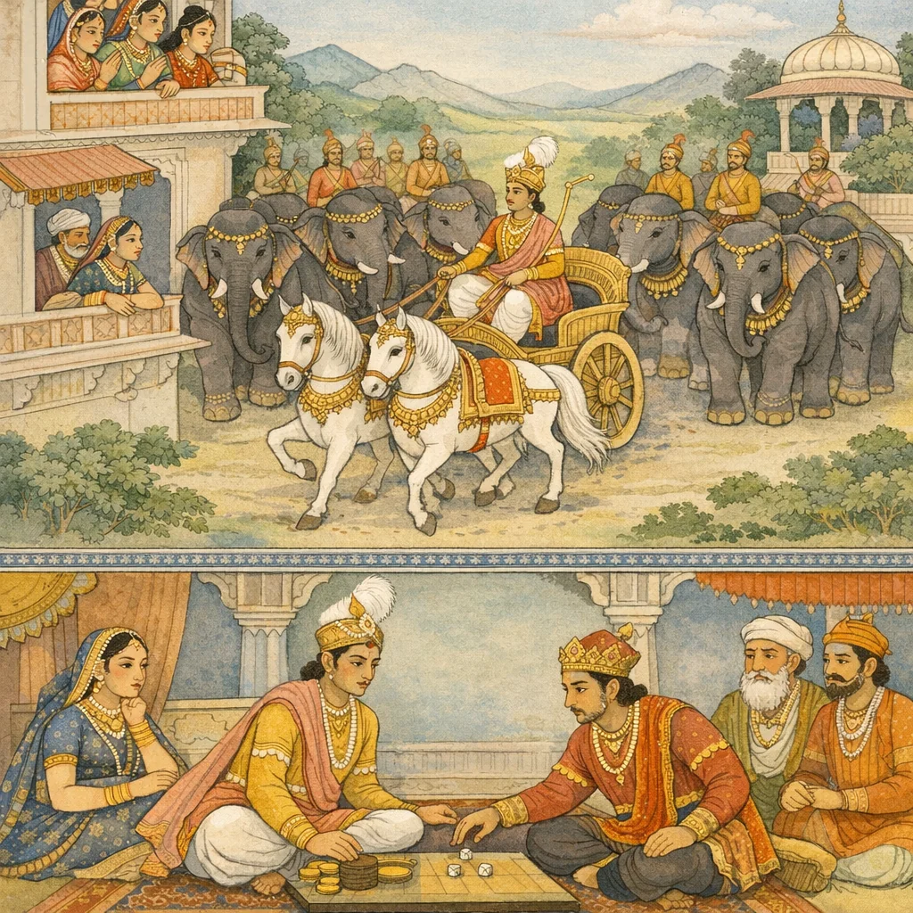 Chapter Arc: ऋतुपर्ण के स्वदेश लौट जाने के बाद, नल अपने भीतर संचित धैर्य और कौशल के साथ निर्णायक प्रतिज्ञा लेकर पुष्कर के द्वार पर पहुँचता है—अब भाग्य नहीं, न्याय बोलने वाला है। → राजसी वैभव के साथ नल का आगमन होता है—एक शुभ्र रथ, सोलह हाथियों का घेरा, पचास घोड़े और असंख्य पदाति; पृथ्वी काँपती-सी लगती है। सभा में संदेश फैलता है कि वही नल लौट आया है। नल पुष्कर को चुनौती देता है और स्पष्ट करता है कि वह ‘परकृत दोष’ (कली के अपराध) को पुष्कर के माथे नहीं मढ़ेगा—पर राज्य और दमयन्ती का अपमान अब सह्य नहीं। → पुष्कर और नल के बीच द्यूत आरम्भ होता है; इस बार नल के पास ऋतुपर्ण से प्राप्त अक्ष-विद्या/कौशल है। पुष्कर की वाणी—“पणावः किं व्याहरसे… ततः प्रावर्तत द्यूतं”—के साथ खेल चरम पर पहुँचता है और नल पुष्कर को पराजित कर देता है, धन-वैभव और राज्य पर अपना अधिकार पुनः सिद्ध करता है। → नल पुष्कर को जीवनदान देता है और कहता है कि वह कली के कारण हुए अपराध को पुष्कर पर नहीं थोपेगा—‘यथासुखं वै जीव… प्राणानवसृजामि ते’। पुष्कर पराजय स्वीकार कर राज्य लौटाता है; नगर-जन और मंत्रीगण नल का स्वागत करते हैं, जैसे इन्द्रयज्ञ के शतक्रतु की उपासना को देव लौट आए हों। दमयन्ती के पुनर्मिलन और प्रतिष्ठा की पुनर्स्थापना का भाव दृढ़ होता है। → नल का ‘कृतकृत्य’ होने का संकेत मिलते हुए भी, द्यूत के विष और कली की छाया का प्रश्न शेष रहता है—क्या यह विजय केवल राज्य की है, या आत्म-विजय की भी?
