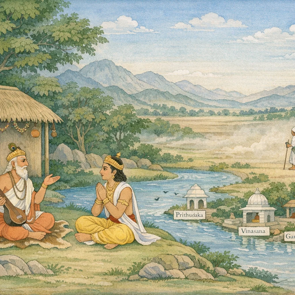 Chapter Arc: नारद युधिष्ठिर के सम्मुख कुरुक्षेत्र की महिमा का संवाद उपस्थित करते हैं—यहाँ तक कि केवल ‘मैं कुरुक्षेत्र जाऊँगा, वहाँ निवास करूँगा’ ऐसा कह देना भी पाप-क्षय का कारण बताया जाता है। → तीर्थ-यात्रा का मानचित्र खुलता है: कुरुक्षेत्र की धूल तक की पावनता, व्रत-उपवास, ब्रह्मचर्य, और क्रमशः अनेक तीर्थों (मुञ्जवट, मिश्रक, सप्तसारस्वत, गंगाह्रद, कन्याश्रम आदि) के विशिष्ट फल—हर स्थल के साथ नियम कठोर होते जाते हैं और फल अधिक ‘राजसूय-अश्वमेध’ तुल्य घोषित होते जाते हैं। → कुरुक्षेत्र-स्तुति अपने चरम पर पहुँचती है—वायु से उड़कर आई कुरुक्षेत्र की धूल का स्पर्श भी दुष्कृतकर्मा को परम गति दे सकता है; और गंगाह्रद जैसे तीर्थ में एकाग्रचित्त ब्रह्मचर्यपूर्वक स्नान को राजसूय-अश्वमेध के फल के समकक्ष कहा जाता है। → नारद तीर्थों के नियम, रात्रि-उपवास, स्नान-विधान और फलश्रुति को व्यवस्थित रूप से समेटते हैं—युधिष्ठिर के लिए यह संदेश स्पष्ट होता है कि वनवास की पीड़ा के बीच भी धर्म का एक मार्ग ‘तीर्थ-चर्या’ है, जो अंतःशुद्धि और पुण्य-संचय का साधन बनती है। → तीर्थ-क्रम अभी आगे भी विस्तृत है—अगले स्थलों की महिमा और उनसे जुड़ी प्राचीन सिद्ध-परंपराएँ (जैसे मड़कणक आदि) आगे के अध्यायों में और गहराई से खुलने का संकेत देती हैं।