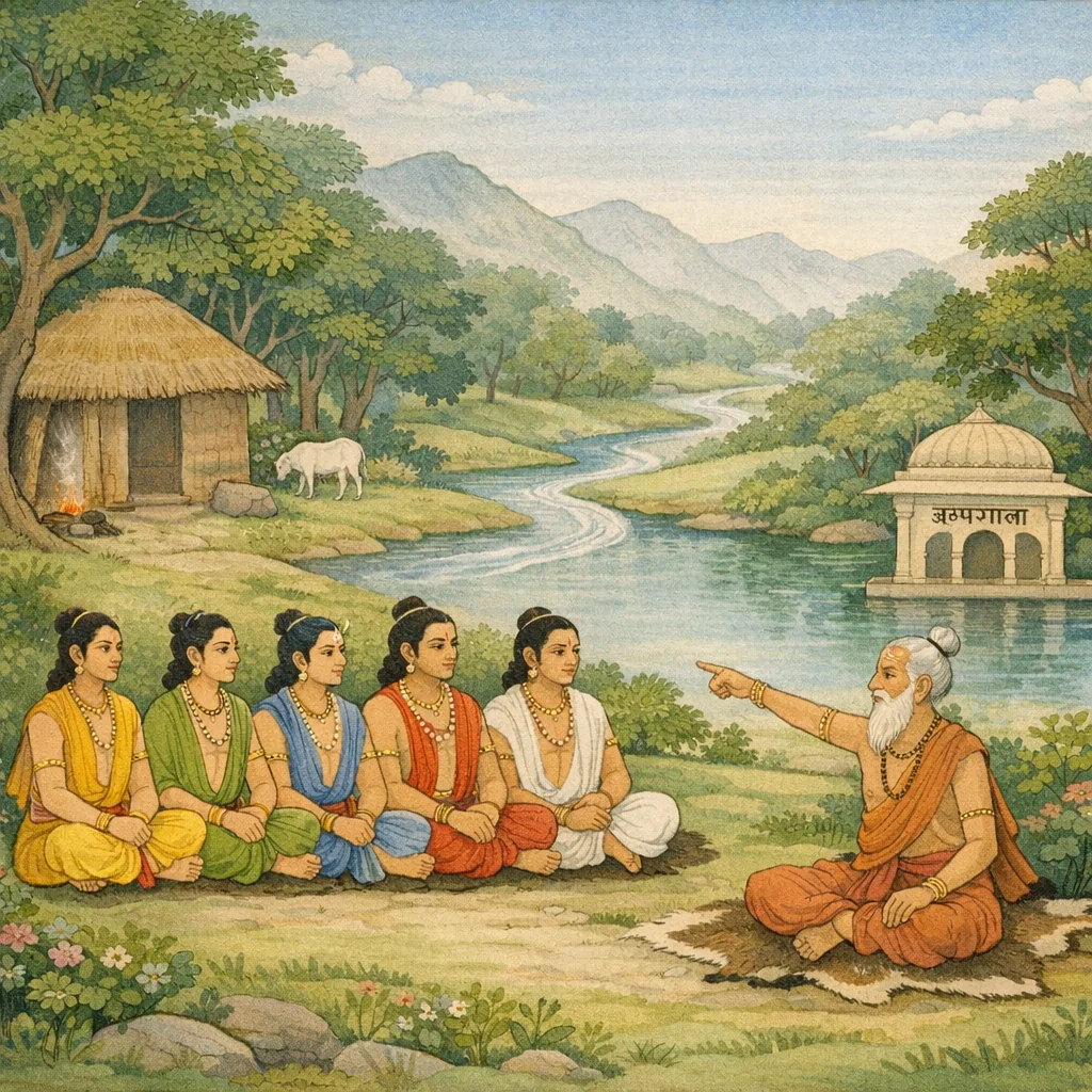 Chapter Arc: जनमेजय के समक्ष वैशम्पायन पाण्डवों की उस व्याकुलता का चित्र खींचते हैं—अर्जुन के वियोग से उनका मन दीन है, और वे उससे मिलने को आतुर हैं; इसी बेचैनी के बीच धौम्य उन्हें पूर्वदिशा के तीर्थों का मार्ग बताने लगते हैं। → धौम्य एक-एक कर पुण्याश्रमों, नदियों और सरोवरों का वर्णन करते हैं—गोमती जैसे देवर्षि-सेवित तीर्थ, देवताओं की यज्ञभूमियाँ, और ऐसे स्थल जहाँ तप, दान, व्रत तथा यज्ञ से पितृ-ऋण और कुल-उद्धार का विधान बताया गया है; तीर्थों की महिमा जितनी बढ़ती है, उतना ही पाण्डवों का ‘उद्धार’ और ‘आश्वासन’ पाने का आग्रह तीव्र होता जाता है। → तीर्थ-महात्म्य का शिखर उन वचनों में आता है जहाँ धौम्य ‘गया’ आदि स्थलों के फल का प्रतिपादन करते हैं—अश्वमेध/वृषोत्सर्ग जैसे कर्मों द्वारा ‘दश पूर्वान् दशावरान्’ तक संतति-उद्धार का कथन; साथ ही विश्वामित्र के कान्यकुब्ज प्रसंग जैसे आख्यान-बीज तीर्थों को केवल भूगोल नहीं, धर्म-इतिहास बना देते हैं। → वर्णन पूर्वदिशा के पवित्र स्थलों की एक सुसंगत माला बनकर स्थिर होता है—भागीरथी-सम्बद्ध सरोवर/‘ब्रह्मशाला’ जैसे स्थानों का स्मरण और देववन जैसे तपोवनों का संकेत पाण्डवों को यह बोध कराता है कि वनवास केवल दण्ड नहीं, शुद्धि और संबल का पथ है। → धौम्य की तीर्थ-सूची आगे भी विस्तृत होने का संकेत देती है—पाण्डव अभी मार्ग पर हैं, और अर्जुन-वियोग की पीड़ा के बीच अगला तीर्थ-क्रम तथा उससे जुड़ी कथाएँ शेष हैं।