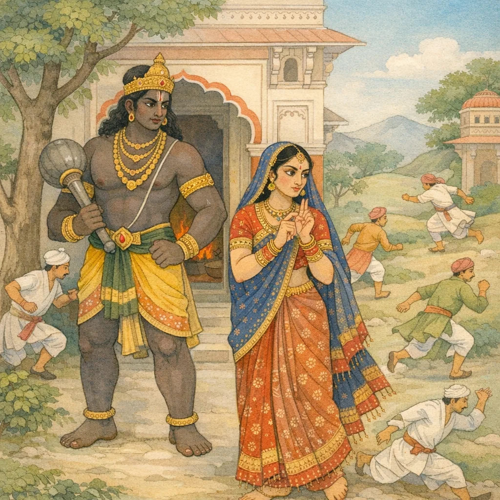 Chapter Arc: भीमसेन द्वारा कीचक-पक्ष के सूतपुत्रों का संहार हो चुका है; भयमुक्त द्रौपदी (सैरन्ध्री) राजमहल की ओर लौटती है और नगर में गन्धर्व-भय की लहर दौड़ जाती है। → मार्ग में बिखरे-गिरे सूतों का दृश्य ‘वज्र से विदीर्ण पर्वत-शिखर’ जैसा प्रतीत होता है; लोग दिशाओं में भागते हैं, कोई आँखें मूँद लेता है—सबको लगता है कि गन्धर्वों ने विराटनगर पर धावा बोल दिया है। → पाकशाला-द्वार पर द्रौपदी मतवाले गजराज-से अडिग भीमसेन को देख संकेतों में कृतज्ञता प्रकट करती है; फिर बृहन्नला (अर्जुन) सैरन्ध्री से पूछती है—कैसे छूटी, वे पापी कैसे मारे गए—और द्रौपदी घटना का सूत्र खोलती है। → सुदेष्णा, विराट के कथनानुसार, भयभीत होकर सैरन्ध्री को जहाँ चाहे जाने की अनुमति देती है; द्रौपदी उत्तर देती है कि उसके लिए केवल तेरह दिन और क्षमा रखें—तब गन्धर्व (पाण्डव) कृतकृत्य होकर राजा का हित करेंगे। → द्रौपदी का ‘तेरह दिन’ का संकेत गुप्त-परिचय के अंतिम चरण और निकट भविष्य में विराट के साथ पाण्डवों के प्रकट सहयोग की आहट देता है।