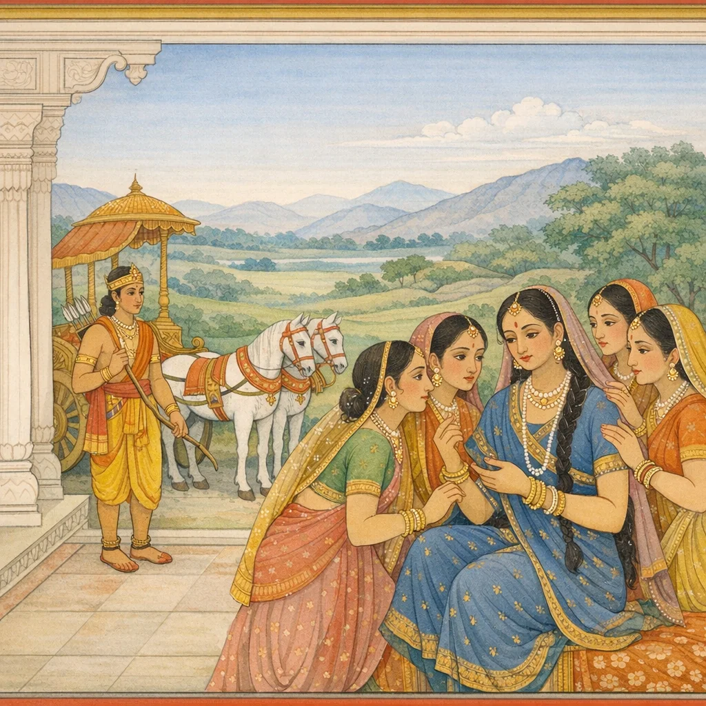 Chapter Arc: गौ-हरण का संकट मस्त्य-राज्य पर छा जाता है; राजकुमार उत्तर रणभूमि की ओर निकलने को उद्यत है, पर रथ-सारथि का अभाव उसे भीतर से डगमगाता है। → उत्तरा (राजा विराट की पुत्री) राजकुमार को स्मरण कराती है कि कौरव गौओं को बहुत दूर ले जाने से पहले शीघ्र प्रस्थान आवश्यक है; वह बृहन्नला से विनयपूर्वक आग्रह करती है कि वह उत्तर का सारथ्य करे। बृहन्नला (अर्जुन) अपने नपुंसक-वेष की मर्यादा निभाते हुए कहता है कि वह गीत-नृत्य-वाद्य जानता है, सारथ्य नहीं—पर कन्याओं के आग्रह और समय की तात्कालिकता से दबाव बढ़ता जाता है। → कन्याओं के बीच पाण्डुनन्दन अर्जुन (बृहन्नला) हँसते हुए—मेघ-दुन्दुभि-सा गंभीर स्वर लिए—सारथ्य-कार्य स्वीकार करने की ओर झुकता है; उत्तर के ‘रण-प्रस्थान’ का निर्णायक क्षण बनता है, जहाँ छिपा हुआ वीरत्व पुनः युद्ध-भूमि की ओर मुड़ता है। → बृहन्नला उत्तर के रथ का सारथि बनने को तैयार होता है; उत्तर का प्रस्थान सुनिश्चित होता है और गौ-रक्षा हेतु अभियान को गति मिलती है। → रथ चल पड़ा—पर आगे कौरव-सेना का सामना, उत्तर का भय, और बृहन्नला के भीतर छिपे गांडीवधारी अर्जुन का प्रकट होना अभी शेष है।