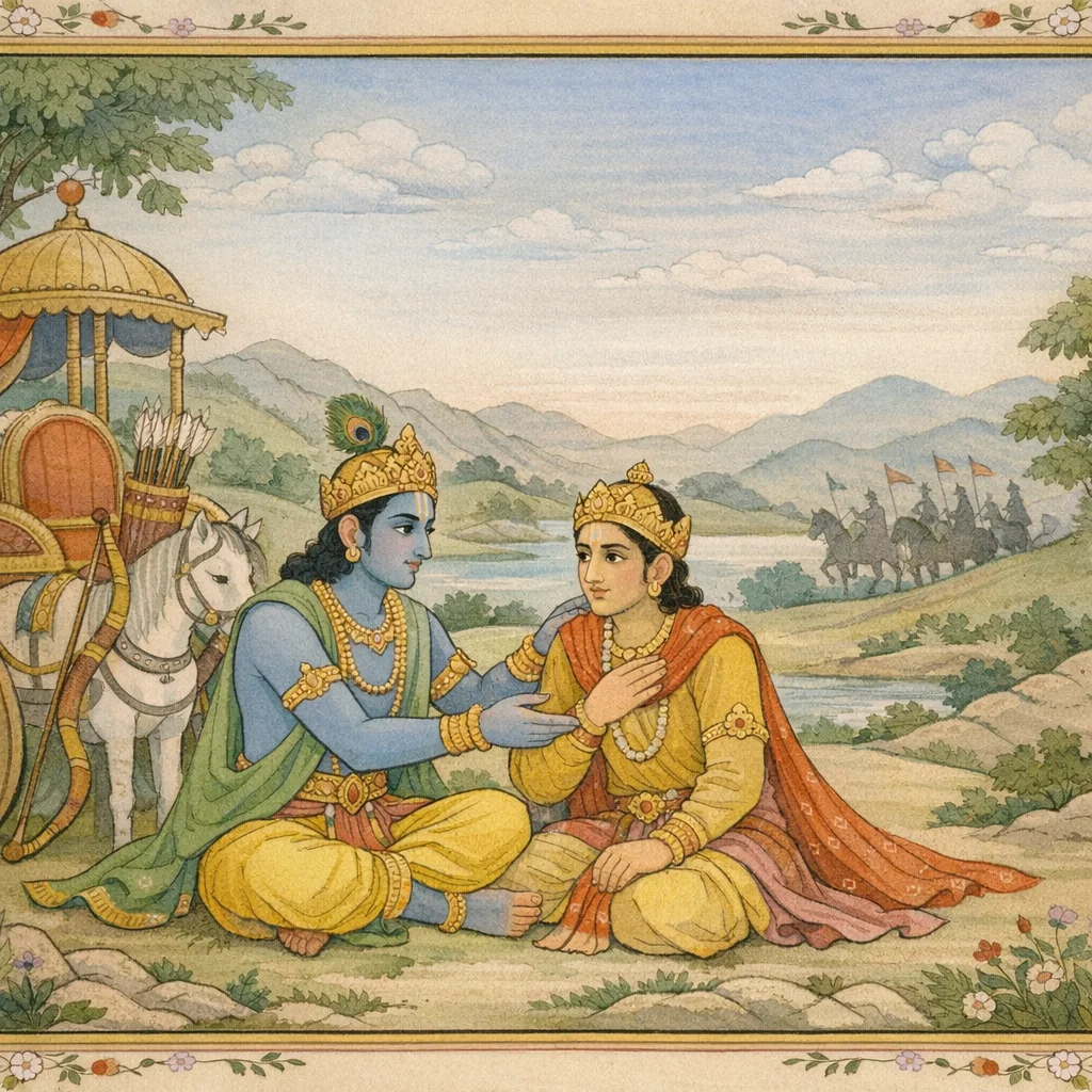 Chapter Arc: उत्तर के भय-ग्रस्त हृदय को अर्जुन का आश्वासन मिलता है—रणविशारद पार्थ कहता है कि अब किसी शत्रु का भय शेष नहीं; वह अकेला ही सबको रणभूमि से खदेड़ देगा। → उत्तर स्वयं को सारथि के रूप में प्रस्तुत करता है—घोड़ों को साधने और रथ हाँकने का अभ्यास बताकर वह अर्जुन की सहायता का संकल्प लेता है। अर्जुन, अपने दिव्य-अनुभवों और गुरुओं-देवताओं के आश्रय का स्मरण कर, उत्तर के भीतर उठते ‘मानस-ज्वर’ को शांत करने हेतु उसे शीघ्र रथ चलाने का आदेश देता है। → अर्जुन का आत्मविश्वास चरम पर पहुँचता है—वह निवातकवच और पौलोम दैत्यों के विरुद्ध इन्द्रार्थ युद्ध का उदाहरण देकर बताता है कि तब भी उसे सहायता मिली थी; अब तो द्रोण, देवगण, कृप, कृष्ण-माधव और शंकर (पिनाकपाणि) के आश्रय से वह कौरव-सेना को कैसे न जीतेगा? → उत्तर का भय क्रमशः साहस में ढलता है; वह अर्जुन के वचनों से प्रेरित होकर सारथ्य-कार्य स्वीकार करता है और युद्ध-तैयारी पूर्ण होती है—रथ आगे बढ़ने को तत्पर होता है। → रथ के बढ़ते ही अगला क्षण कौरवों से प्रत्यक्ष सामना और अर्जुन के गुप्त-परिचय के उद्घाटन की दहलीज़ पर आ टिकता है।