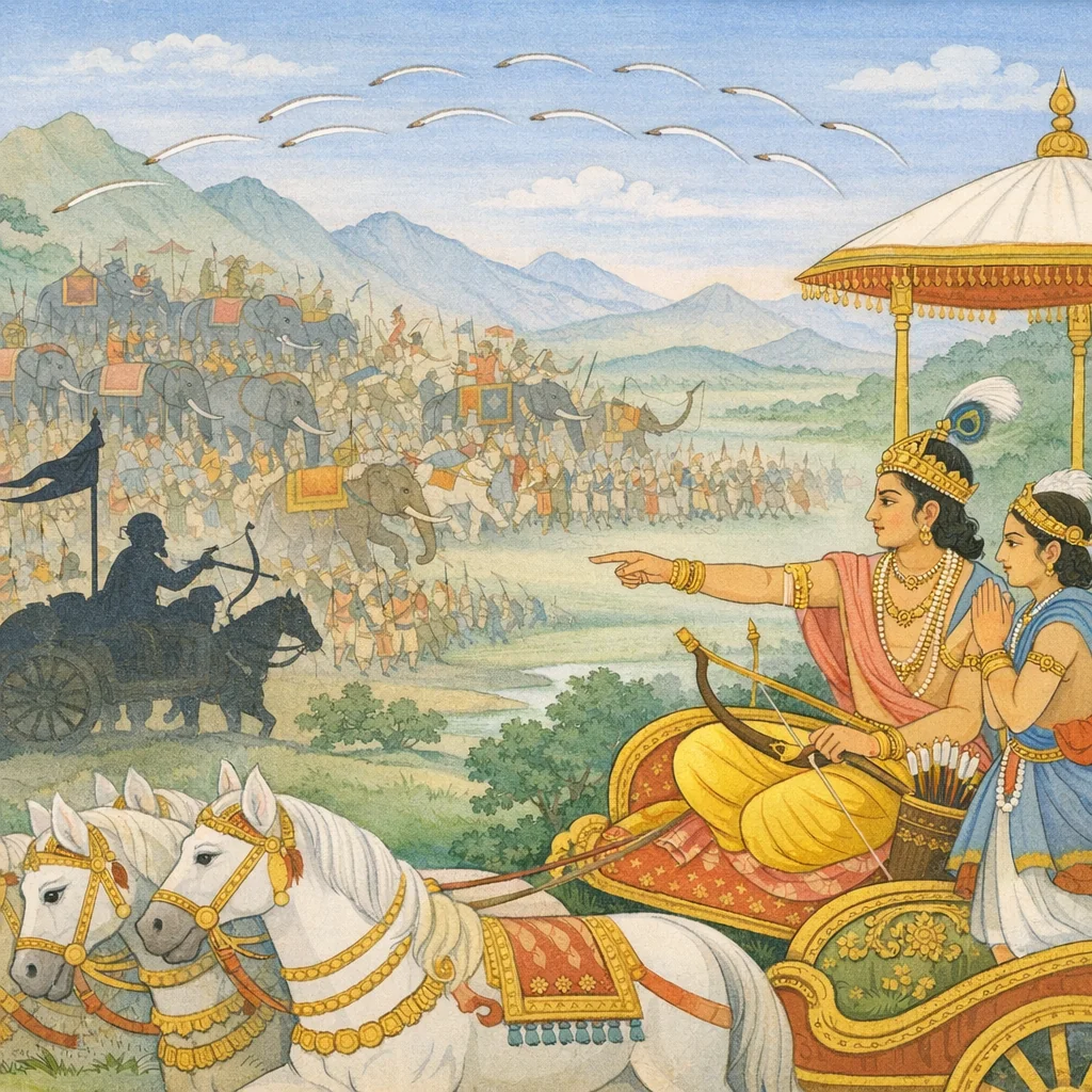 Chapter Arc: कर्ण के पलायन के बाद रणभूमि में धूल और शंखनाद के बीच अर्जुन (बृहन्नला) उत्तरकुमार को धैर्य बँधाते हैं—और सामने कौरवों की विशाल, रथ-हाथी-घोड़े से भरी सेना फिर से चुनौती बनकर खड़ी है। → उत्तर, जो बाणों से बुरी तरह घायल और भयाक्रान्त है, कौरव-सेना की महत्ता देखकर अर्जुन से पूछता है; अर्जुन उसे रथ-चालन में स्थिर रहने, सम-विषम भूमि में न घबराने और घोड़ों को साधे रखने का उपदेश देता है। साथ ही वह अपने दिव्यास्त्र-शिक्षण और सामर्थ्य का स्मरण कराकर उत्तर के भीतर टूटती हुई हिम्मत को जोड़ता है। → अर्जुन प्रतिज्ञा करता है कि वह कौरव-सेना को अपने बाणों से ‘चक्र’ की भाँति घुमाकर, व्याध की तरह घोंसले में बैठे पक्षियों को गिराने जैसा संहार-प्रदर्शन करेगा; फिर किरीटधारी कौन्तेय लक्ष्य साधकर दिशाओं में बाण-वर्षा करता है और दुःशासन आदि कौरववीरों को पराजित कर देता है। → उत्तर का भय शान्त होता है; अर्जुन की अजेयता और धनुर्विद्या का प्रत्यक्ष प्रमाण कौरव-पक्ष को पीछे हटने/अस्त-व्यस्त होने को बाध्य करता है, और गो-रक्षा का उद्देश्य सुरक्षित दिशा में बढ़ता है। → कौरव-सेना के शेष प्रमुख योद्धा (विशेषतः भीष्म जैसे महारथी) अभी मैदान में हैं—अर्जुन की अगली चाल और कौरवों की पुनर्संरचना का संकट बना रहता है।