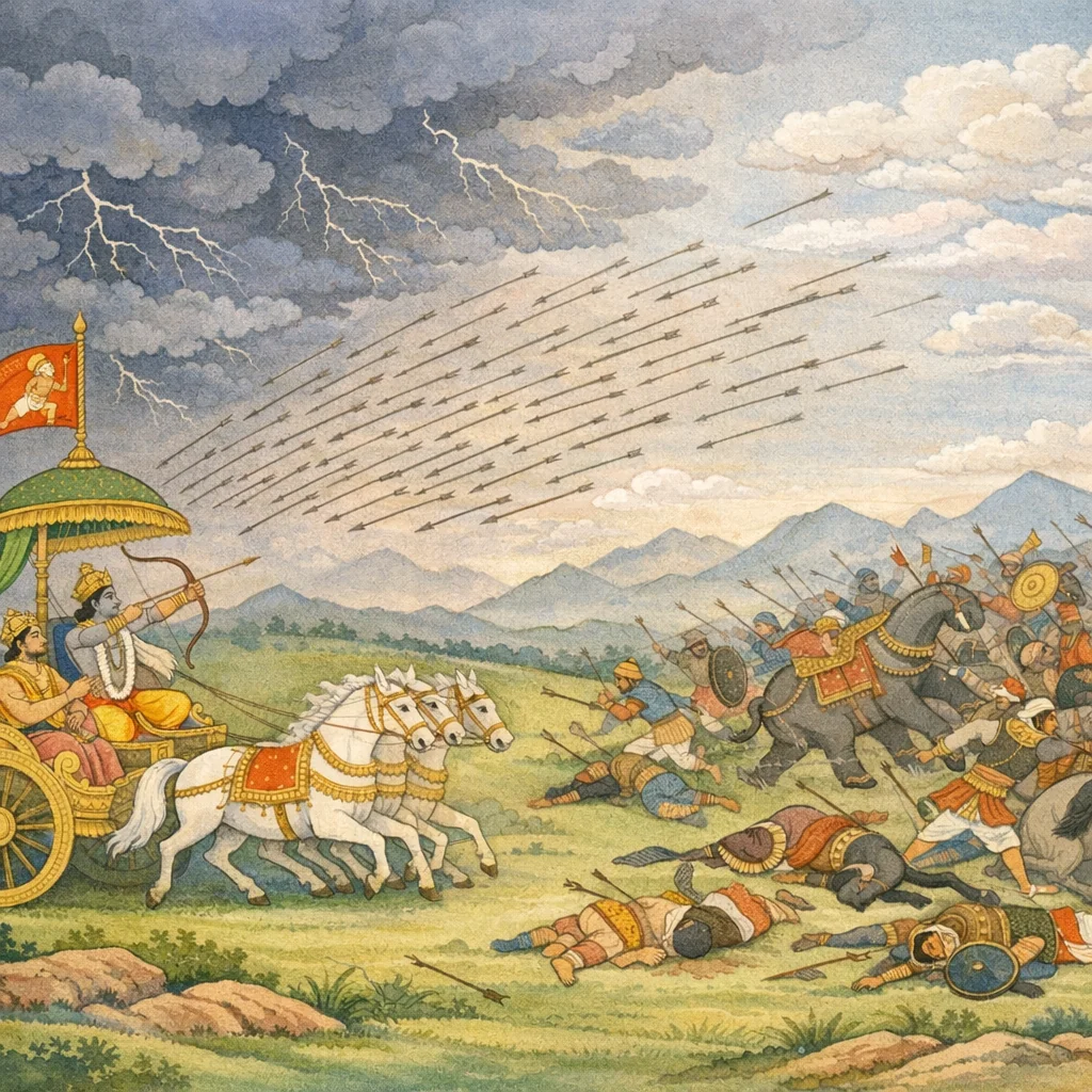 Then Arjuna—called Bībhatsu, the great chariot-warrior—smiled and, with calm confidence, fitted to the Gāṇḍīva the divine weapon of Indra, blazing like the sun. The moment signaled not mere display of power, but the disciplined, rightful use of celestial force in a dharmic battle, where mastery was joined to restraint and purpose.