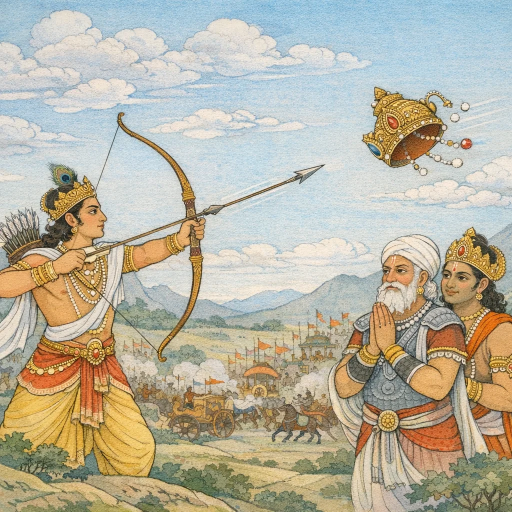 Vaiśaṃpāyana said: Arjuna (Pārtha) severed Duryodhana’s splendid, jewel-inlaid crown with a single arrow. In the midst of battle, the act functions as a pointed humiliation and a measured display of mastery—asserting superiority without immediately taking life—thus highlighting the warrior’s capacity to restrain violence even while fulfilling kṣatriya-duty in war.