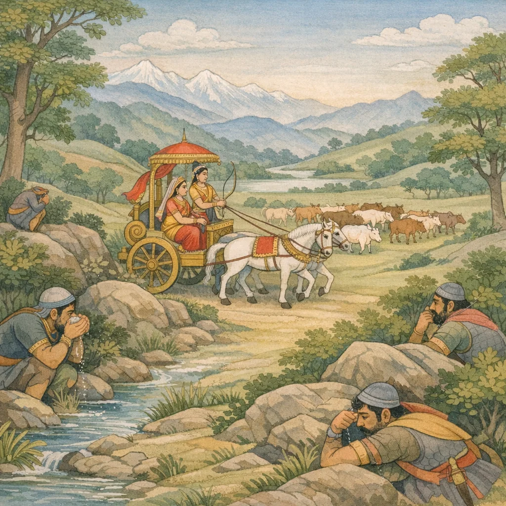 Chapter Arc: कौरवों को संग्राम में पराजित कर ‘वृषभेक्षण’ अर्जुन विराट का छीना हुआ महान् गोधन समेटकर लौटाता है—और विजय के बाद का दृश्य युद्ध से अधिक अर्थपूर्ण बन उठता है। → कौरव-दल भय से तितर-बितर है; अनेक सैनिक जंगलों में छिपे, भूख-प्यास से व्याकुल, दिशाहीन और चेतना-शून्य भटकते दिखते हैं—पराजय का मानवीय, करुण पक्ष उभरता है। → पार्थ ‘परमार्यकर्म’ कर शत्रुओं को परास्त करके उत्तर के रथ की रश्मियाँ फिर अपने हाथ में लेता है और बृहन्नला-रूप में हर्षित मन से नगर में प्रवेश करता है—विजय और गुप्त-परिचय का द्वंद्व एक साथ चरम पर पहुँचता है। → गोधन सुरक्षित लौट आता है; कौरवों का पलायन पूर्ण होता है; अर्जुन-उत्तर का नगर-प्रवेश विजय की औपचारिक परिणति बनता है, पर अर्जुन का वास्तविक परिचय अभी आवरण में रहता है। → नगर में लौटकर उत्तर और विराट-सभा के सामने इस विजय का श्रेय, सत्य और बृहन्नला की पहचान किस रूप में प्रकट होगी—यह प्रश्न अगले प्रसंग की ओर धकेलता है।