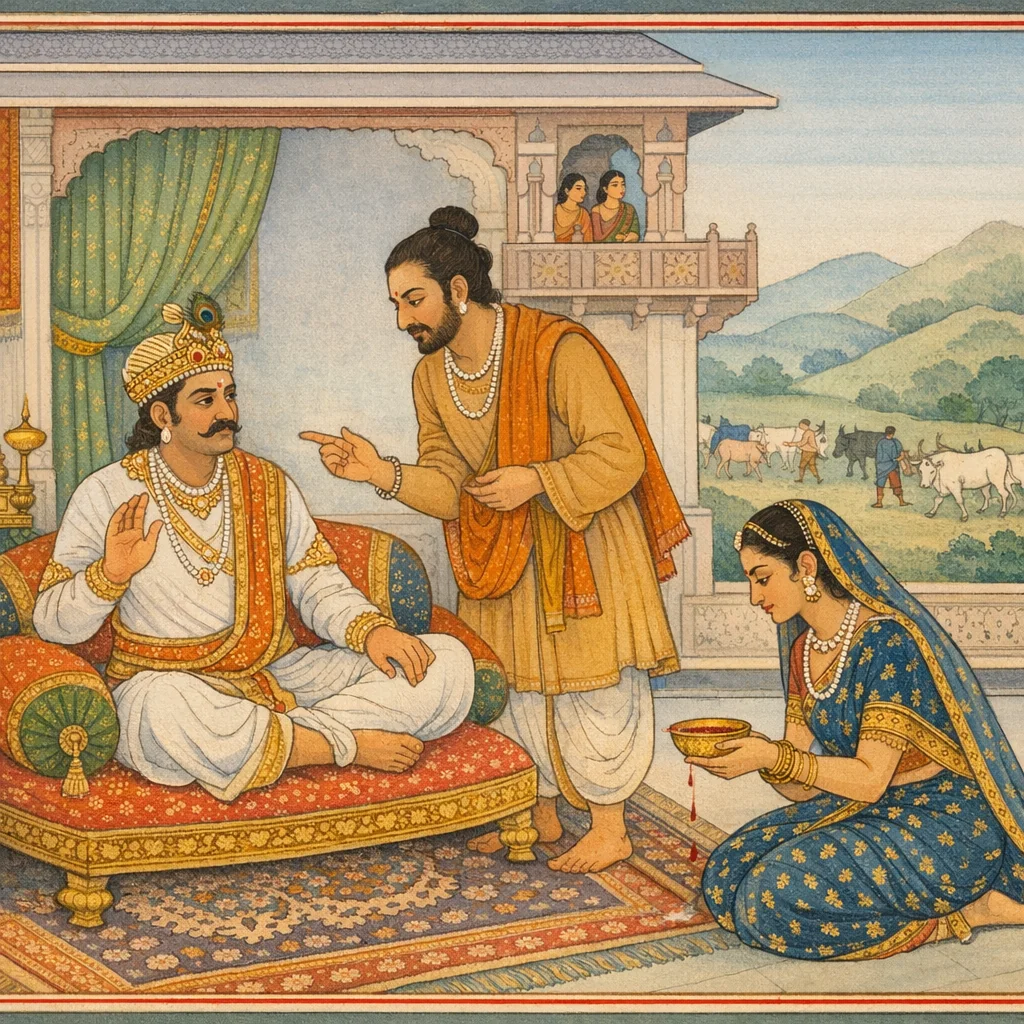 Chapter Arc: त्रिगर्तों को पराजित कर और समस्त गोधन छुड़ाकर उत्तर (अर्जुन-सह-उत्तर) विजयी वैराटनगर लौटता है; नगर में जय-ध्वनि है, पर राजसभा के भीतर विराट के मन में उत्तर के विषय में गहरी चिन्ता और उत्सुकता उमड़ती है। → विराट सिंहासनारूढ़ होकर सभासदों से घिरते हैं; युधिष्ठिर (कंक) से पाण्डवों के विषय में प्रश्न उठते हैं—क्या उसने युधिष्ठिर को देखा/सुना है, और वे भ्राताओं सहित कहाँ हैं? इसी बीच कीचक-वध के बाद की दबी हुई आशंका और द्रौपदी (सैरन्ध्री) पर हुए अपमान की स्मृति भी वातावरण को तना रखती है; द्रौपदी की चोट (नाक से रक्त) का प्रसंग संकेत देता है कि यह विजय केवल बाहरी नहीं, भीतर की आग भी है। → युधिष्ठिर विराट को निर्णायक आश्वासन देता है—जिस रथ का सारथी बृहन्नला हो, उसकी विजय ध्रुव है; वह बृहन्नला को इन्द्र के मातलि और कृष्ण के सारथ्य के समकक्ष ठहराकर उत्तर की विजय का रहस्य-गौरव स्थापित करता है। → विराट का भय और संशय शान्त होता है; उत्तर की प्रशंसा, गोधन-वापसी का उत्सव, और राजसभा में पाण्डवों के प्रति आदर का भाव दृढ़ होता है—यद्यपि उनके वास्तविक परिचय का आवरण अभी बना रहता है। → विराट के मन में पाण्डवों को पहचानने/सम्मानित करने की चाह और राजकीय निर्णय की दिशा बनती है—पर यह रहस्य कब और कैसे खुलेगा, यही अगला तनाव बनकर रह जाता है।