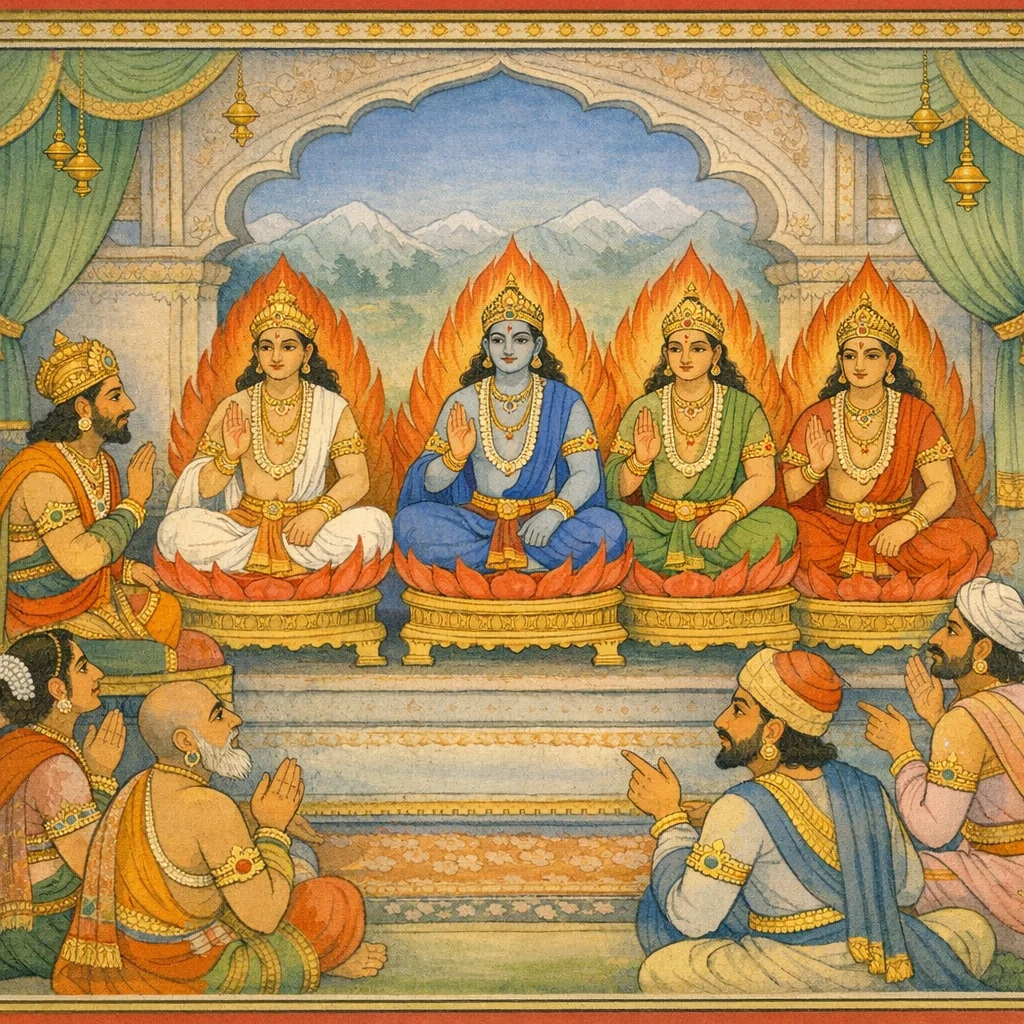 Chapter Arc: अज्ञातवास की प्रतिज्ञा पूर्ण होते ही विराट-सभा के द्वार पर एक अद्भुत दृश्य—युधिष्ठिर को अग्रणी बनाकर, समस्त आभूषणों से विभूषित, तेजस्वी महारथी पाण्डव ऐसे चमकते हैं जैसे द्वार पर मदमत्त गजराज। → सभा में प्रवेश कर वे राजासन-सम आसनों पर अग्नि-सदृश दीप्त होकर बैठते हैं; पहचान का क्षण निकट है—विराट, सभासद, और नगर-जन सबके मन में विस्मय और आशंका साथ-साथ उठती है कि ये कौन दिव्य पुरुष हैं। → सभा में युधिष्ठिर के गुणों का महिमामंडन—दीर्घदर्शी, सत्यवादी, जितेन्द्रिय, यज्ञ-धर्मपरायण, मनु के समान प्रजापालक—ऐसी स्तुति के साथ उनका राजोचित अधिकार प्रकट होता है; ‘ऐसे धर्मात्मा को आसन न देना कैसे संभव?’—यही पहचान-प्रकाश का शिखर बनता है। → पाण्डवों का ‘प्राकट्य’ (प्रकाश) स्थापित होता है—वे अब छिपे सेवक नहीं, धर्म-तेज से युक्त क्षत्रिय-श्रेष्ठ हैं; विराट-सभा में उनका सम्मान और स्थान सुनिश्चित होता है। → अब जब पहचान खुल गई, तो कौरवों तक यह समाचार पहुँचेगा—और द्रौपदी-विवाह/उत्तर-परिणय के सूत्रों के साथ युद्ध की आहट निकट आती है।