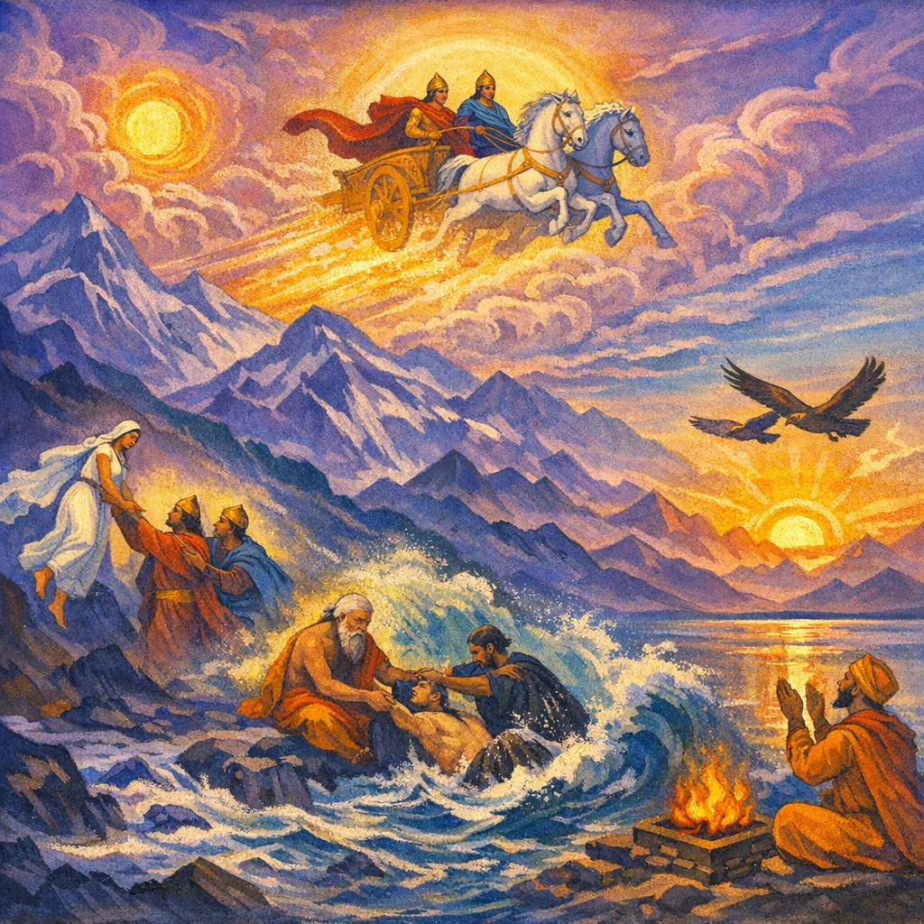 The Aśvins are twin Vedic deities who arrive at dawn in a swift chariot. They are especially known as healers and rescuers who quickly help people in danger or distress.