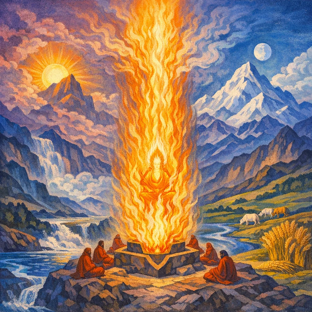 RV 1.140 is an Agni-hymn that invites the altar-fire to take his seat in a well-prepared “womb” (yoni) and to shine as a pure, darkness-dispelling chariot of light. It weaves ritual imagery (kindling, clothing, offering) with cosmic regeneration, portraying Agni as the knower who gathers powers, renews forms, and links the divine Parents (Heaven and Earth) with the flowing Rivers to awaken the hymn and secure nourishment and boons.